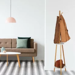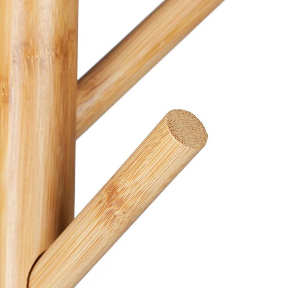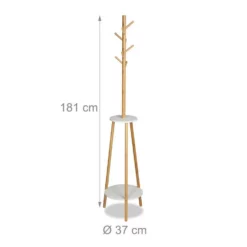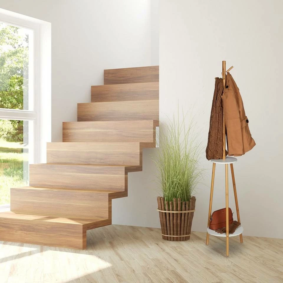 Jackenständer für Zuhause oder im Büro Ein unaufgeräumter Flur oder das Jackenchaos im Büro gehören mit diesem praktischen Garderobenständer der Vergangenheit an. Auf insgesamt 8 Haken können Sie Jacken, Mäntel, Schals & Taschen aufhängen. Die 2 runden Ablagen bieten Platz für Hüte, Mützen & andere Accessoires. Darüber hinaus überzeugt der Garderobenbaum durch sein skandinavisches Design. Stilvoll vereint er Bambus-Elemente mit weißem MDF Holz. So ist die runde Holzgarderobe zugleich ein dekorativer Hingucker in jeder Einrichtung.