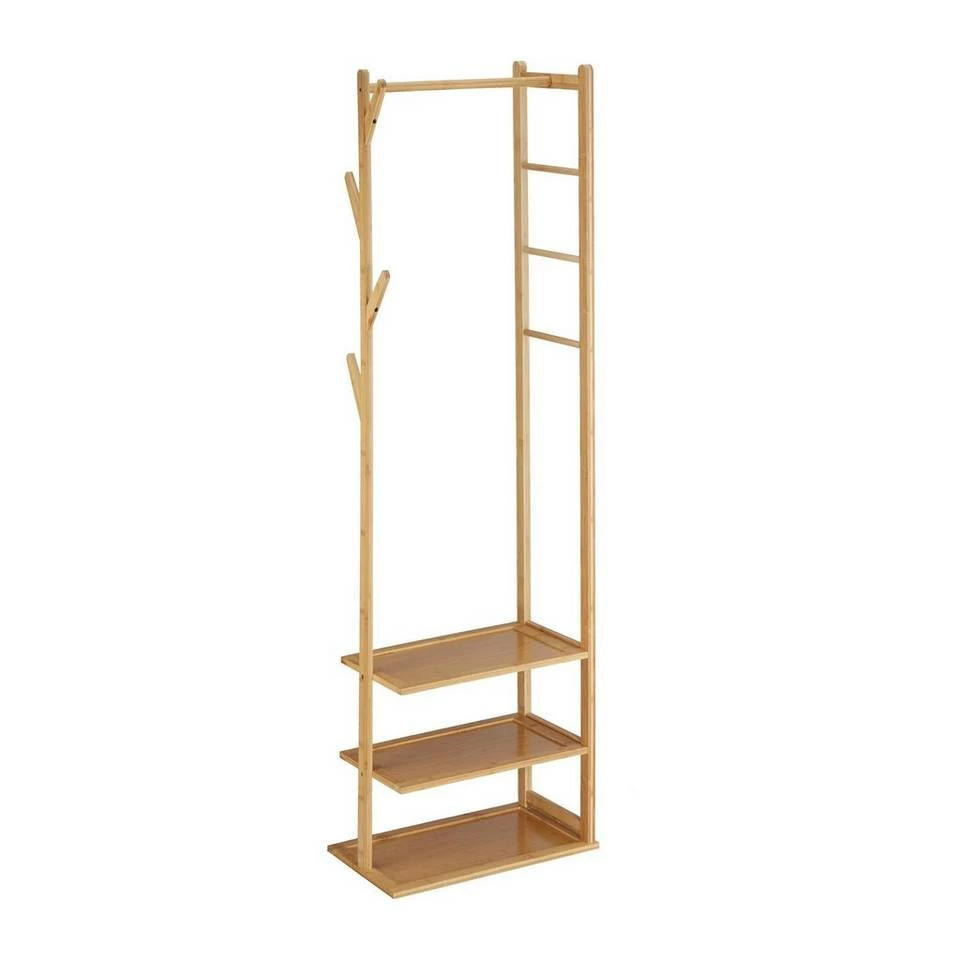 Bambus Garderobe für Wohn- & Schlafbereich Dieser moderne Kleiderständer bietet Dir jede Menge Stauraum im Flur oder Schlafzimmer und überzeugt mit seinem funktionalen Design. Hänge Deine Hemden, Blusen und andere Kleidungsstücke übersichtlich an der Garderobenstange auf. Bis zu 6 Paar Schuhe und Taschen stellst Du auf den Ablagen ab, Jacken und Mäntel finden an den 4 Kleiderhaken einen Platz. Dank des schlichten Looks aus Bambus fügt sich das Kleidergestell in jeden Einrichtungsstil perfekt ein und setzt natürliche Akzente.