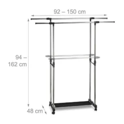Mobile Garderobe für Ihr Zuhause Die Rollgarderobe ist eine starke Alternative zu schwerfälligen Garderobenständern und Schränken, die sich nur mit großem Geschick von Raum zu Raum transportieren lassen. Dank der 360° drehbaren Rollen gleitet der Kleiderständer geradezu über den Boden. Die Standgarderobe hat 2 Kleiderstangen, deren Breite sich dank der Drehgelenke beliebig festlegen lässt. Auch die Höhe können Sie Ihren Bedürfnissen entsprechend anpassen. Die Stoffablage bietet Platz für 3 Paar Schuhe. Um den Kleiderwagen aufzubauen, benötigen Sie kein Werkzeug, nur etwas Fingerspitzengefühl.
