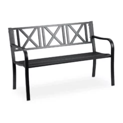 Bequeme Sitzbank für draußen Wenn es draußen wärmer wird, können Sie sich auf der bequemen Ruhebank ausruhen und sich Ihrer Lieblingslektüre oder einem erfrischenden Getränk widmen. Auf der großzügigen Terrassenbank sitzen Sie auch gemütlich zu zweit. Durch die geschwungene Sitzfläche ist hoher Komfort gewährleistet, während das gekreuzte Muster in der Rückenlehne für den optischen Hingucker sorgt. Die robuste Bank ist ideal für den Garten, Balkon oder die Terrasse.