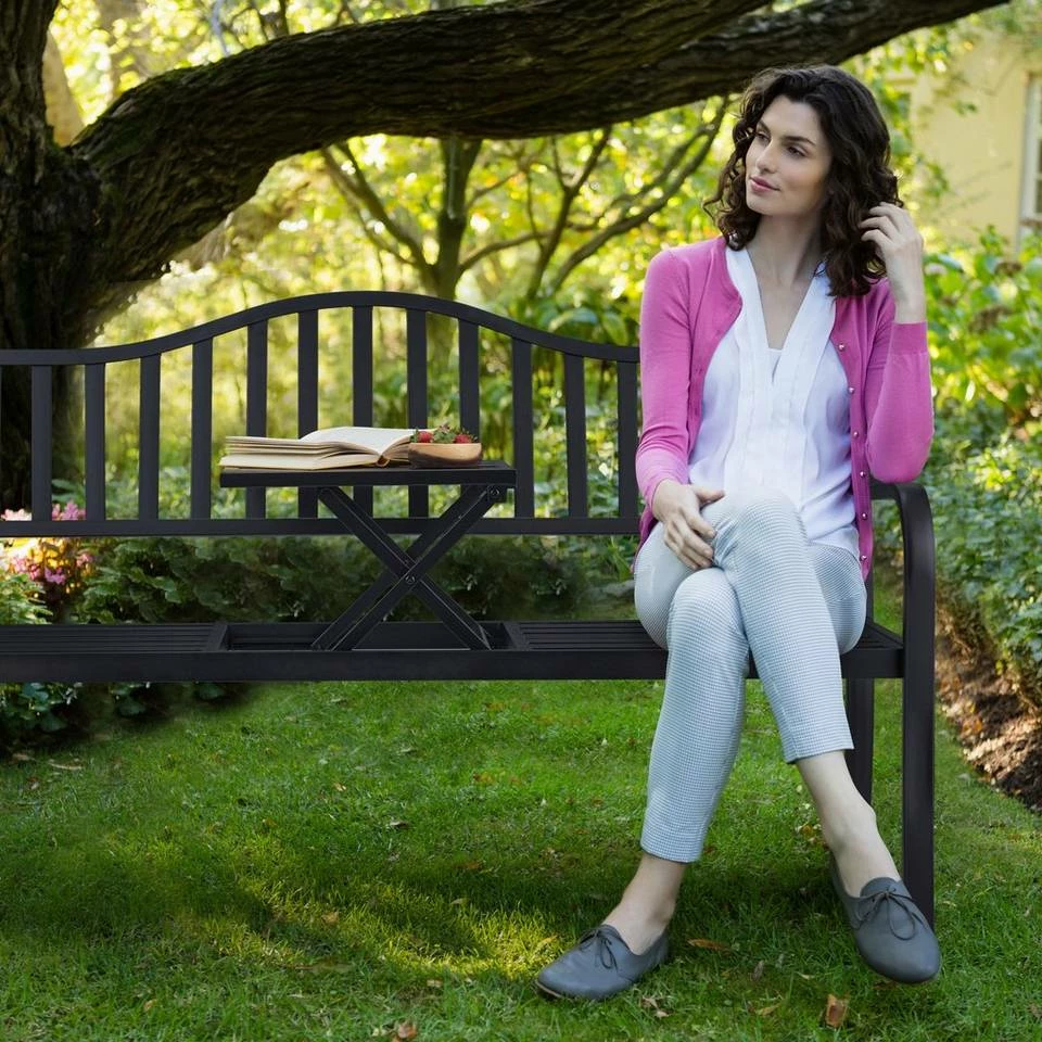 Sitzbank mit integriertem Tisch Holen Sie sich diese dekorative und praktische Kombination aus Sitzgelegenheit und Ablagefläche in Ihren Garten, auf den Balkon oder die Terrasse. Die gemütliche Parkbank bietet auf der großzügigen Sitzfläche Platz für bis zu 3 Personen. Klappen Sie einfach den kleinen Tisch hoch und schon können Sie den Kaffeebecher, Ihr Lieblingsbuch oder das Gläschen Wein zum Feierabend ablegen und dabei zu zweit auf der Bank entspannen.