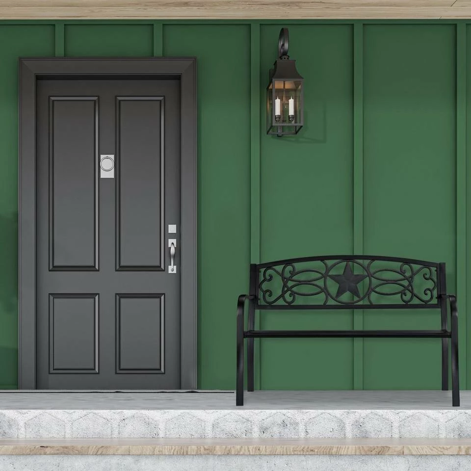 Moderne Gartenbank mit verzierter Lehne Machen Sie es sich gemütlich auf der schwarzen Gartenbank für 2 bis 3 Personen. Die belastbare Metallbank aus Stahl und Gußeisen ist verziert mit einem Sitzkissen optimal für gemütliche Stunden im Freien. Ein Stern-Motiv ziert die Rückenlehne der vielseitig einsetzbaren Parkbank. Ob im Garten, auf der Terrasse oder dem Balkon, die großzügige Ruhebank macht überall eine gute Figur. Genießen Sie zusammen mit Ihren Liebsten die frische Luft auf der Parkbank.