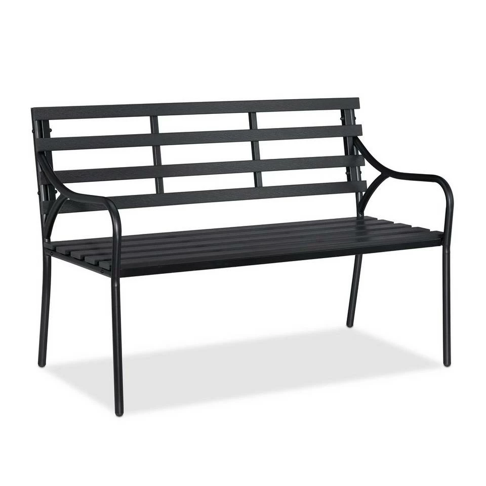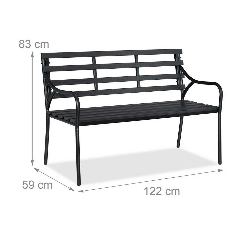 Zweisitzer Gartenbank im Materialmix Machen Sie es sich draußen auf der Sitzbank gemütlich und verbringen Sie zu zweit ruhige Stunden im Garten oder auf dem Balkon. Die Balkonbank überzeugt mit dem schlanken und dabei stabilen Rahmen aus Stahl sowie den robusten Latten aus WPC, einem Holz-Kunststoff-Material in authentischer Holzoptik. Der Aufbau ist zudem angenehm unkompliziert und schnell erledigt. Genießen Sie die warme Sommerzeit im Freien mit der Sitzbank in schlichtem Schwarz.