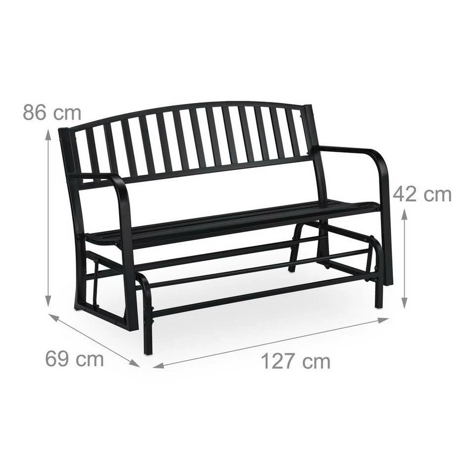 Schwingende Gartenbank für Zwei Bringen Sie Schwung in Ihr Leben mit der wippenden Schaukelbank für Garten oder Balkon. Auf der gemütlichen Gartenbank finden Sie nicht nur Platz für Zwei, sondern schaukeln sanft vor und zurück. Erholung ist garantiert. Die Sitzbank besteht aus schwarzem Stahl mit Pulverbeschichtung. Das schlichte Design der Gartenschaukel fügt sich in jedes Arrangement, sei es im Garten, auf der Terrasse oder dem Balkon. Die kleine Hollywoodschaukel macht überall eine gute Figur.