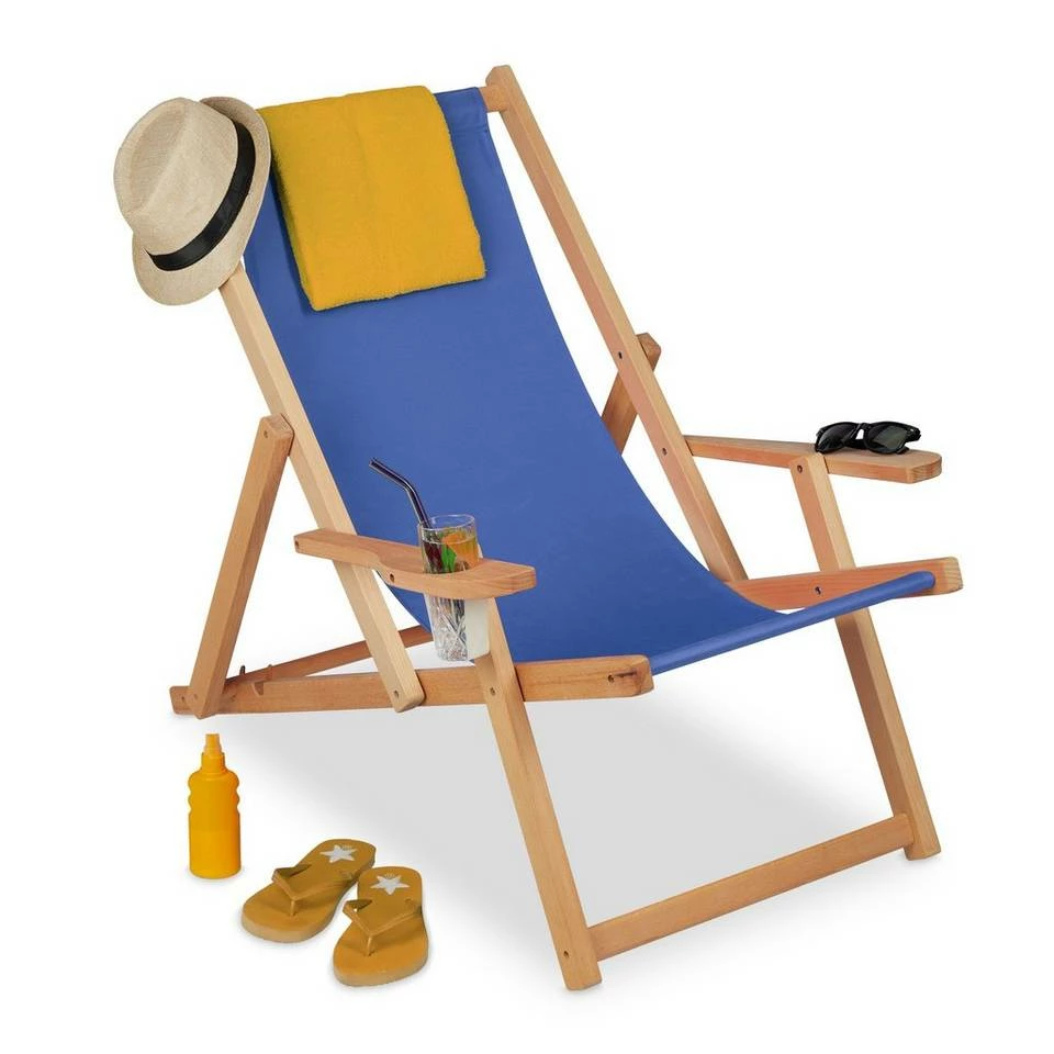 Verstellbarer Strandstuhl mit Getränkehalter Ein entspannender Urlaub muss nicht immer teuer und in weiter Ferne sein. Dieser Klappliegestuhl holt Ihnen das Gefühl von Sonne, Strand und Meer in den heimischen Garten. Machen Sie es sich in einer der 3 Liegepositionen bequem, während Ihr Erfrischungsgetränk griffbereit in dem Getränkehalter steht. Ob auf dem Balkon, im Park oder am Strand, der platzsparend klappbare Sonnenstuhl mit Armlehnen kann problemlos transportiert werden. Schnell und einfach aufgeklappt, bietet Ihnen die Faltliege überall eine flexible Sitzgelegenheit.