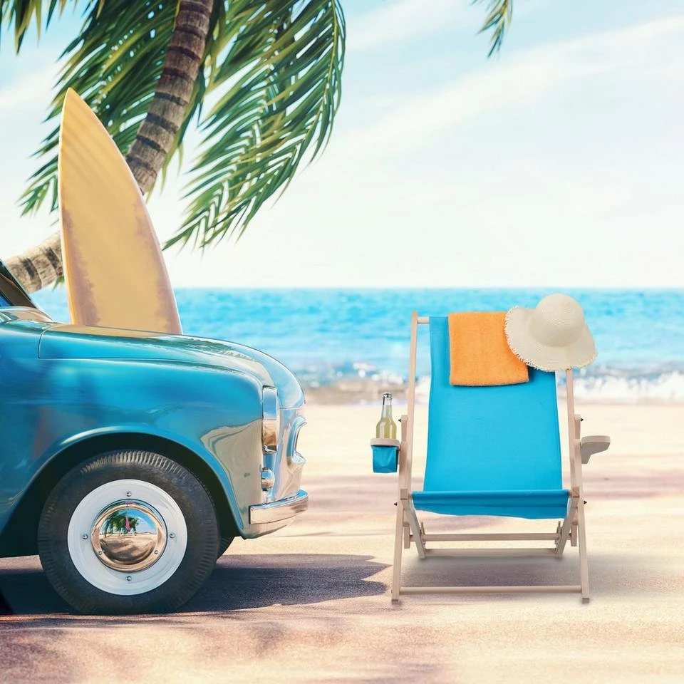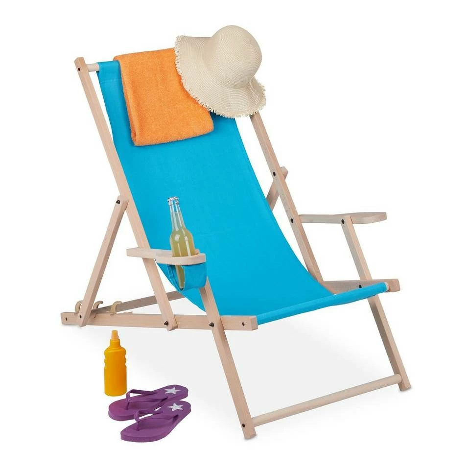 Schöner, klappbarer Sonnenliegestuhl Um es sich auf dem Balkon, der Terrasse oder im Garten gemütlich zu machen, fehlt Ihnen nur noch die passende Sonnenliege. Dieser Holzliegestuhl besitzt 3 verschiedene Liegepositionen, sodass Sie sich rundum entspannen können. Für noch mehr Komfort hat die Klappliege einen Getränkehalter und breite Armlehnen. Bei Bedarf kann die Stoffliege zusammengeklappt und platzsparend verstaut werden. Der Aufbau der Balkonliege ist dank Anleitung schnell erledigt.