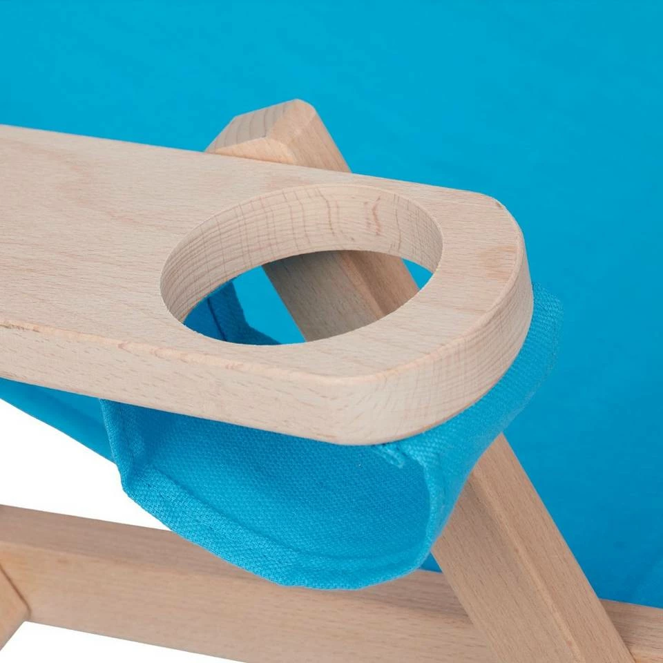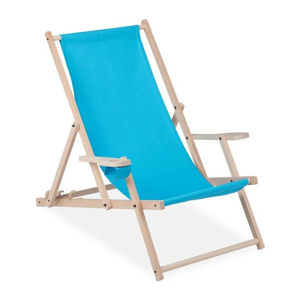 - Details: Liegestuhl aus Buchenholz mit Stoffbezug – Mit Armlehnen und Getränkehalter – Bis 120 kg