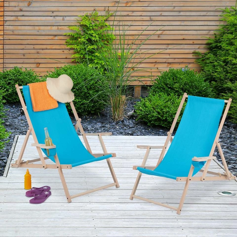 Strandstuhl mit Armlehnen und Getränkehalter Ob Urlaub auf Balkonien oder ein Ausflug an den Strand – mit dem schicken Sonnenstuhl im Doppelpack können Sie überall entspannen. Wählen Sie aus den 3 Liegepositionen die beste aus und machen Sie es sich in dem Stoffliegestuhl mit Armlehnen so richtig bequem. Ein erfrischendes Getränk haben Sie dank des Flaschenhalters stets in Reichweite. Das helle Holzgestell sorgt für die nötige Stabilität der Strandliege, zum Transportieren oder Verstauen ist sie schnell zusammengeklappt.