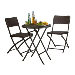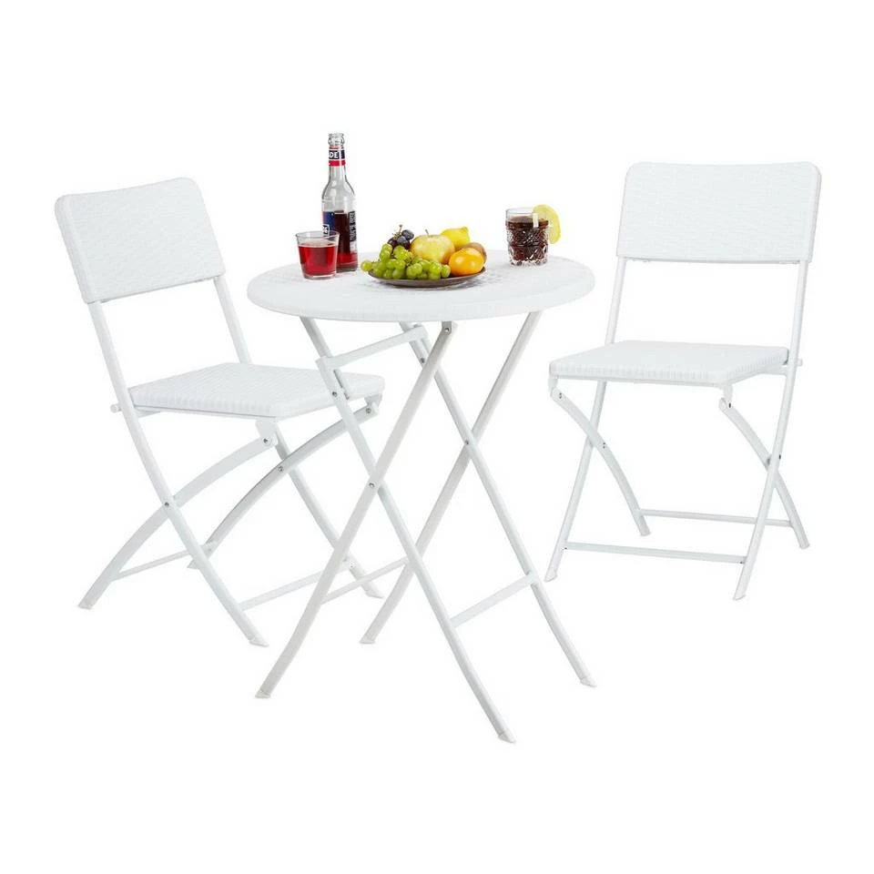 Campingmöbel BASTIAN im Set Das 3-teilige Gartenmöbel Set besteht aus einem Tisch und 2 Stühlen. Die komplette Garnitur kann zusammengeklappt und platzsparend weggepackt werden. Die Campingmöbel eignen sich sowohl für den Indoor- als auch Outdoor-Bereich. Mehrere Gummifüße verleihen dem Tisch und den Stühlen Rutschfestigkeit und schonen gleichzeitig Ihren Fußboden. Alle Set-bestandteile bestehen aus Stahl und in Rattan-Optik gehaltenem Kunststoff. Die Gartenmöbel sind einfarbig und in Schwarz, Braun und Weiß erhältlich. Die Klappstühle können bis 300 kg belastet werden.