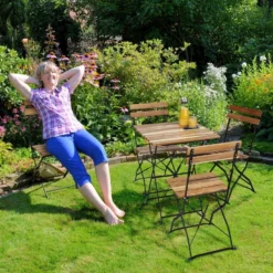 Klappbare Stühle für Eigenheim & Gastronomie Das Gartenstuhl 4er Set enthält 4 praktische Klappstühle, mit denen Sie für den kommenden Sommer gut ausgerüstet sind. Durch ihr Metallgestell und die geölten Holzleisten sind sie widerstandsfähig und können problemlos im Außenbereich, wie Garten, Balkon und Terrasse eingesetzt werden. Dank ihrer mit Gummischonern überzogenen Füße sind sie auch für das Abstellen auf Fliesen und Parkett geeignet. Nach Gebrauch lassen sie sich schnell zusammenklappen und platzsparend lagern.
