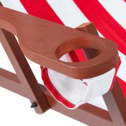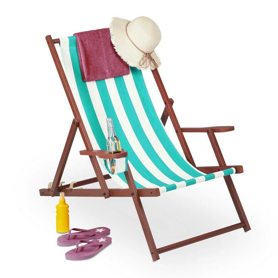 - Details: Liegestuhl aus Buchenholz mit Stoffbezug – Mit Armlehnen und Getränkehalter – Bis 120 kg