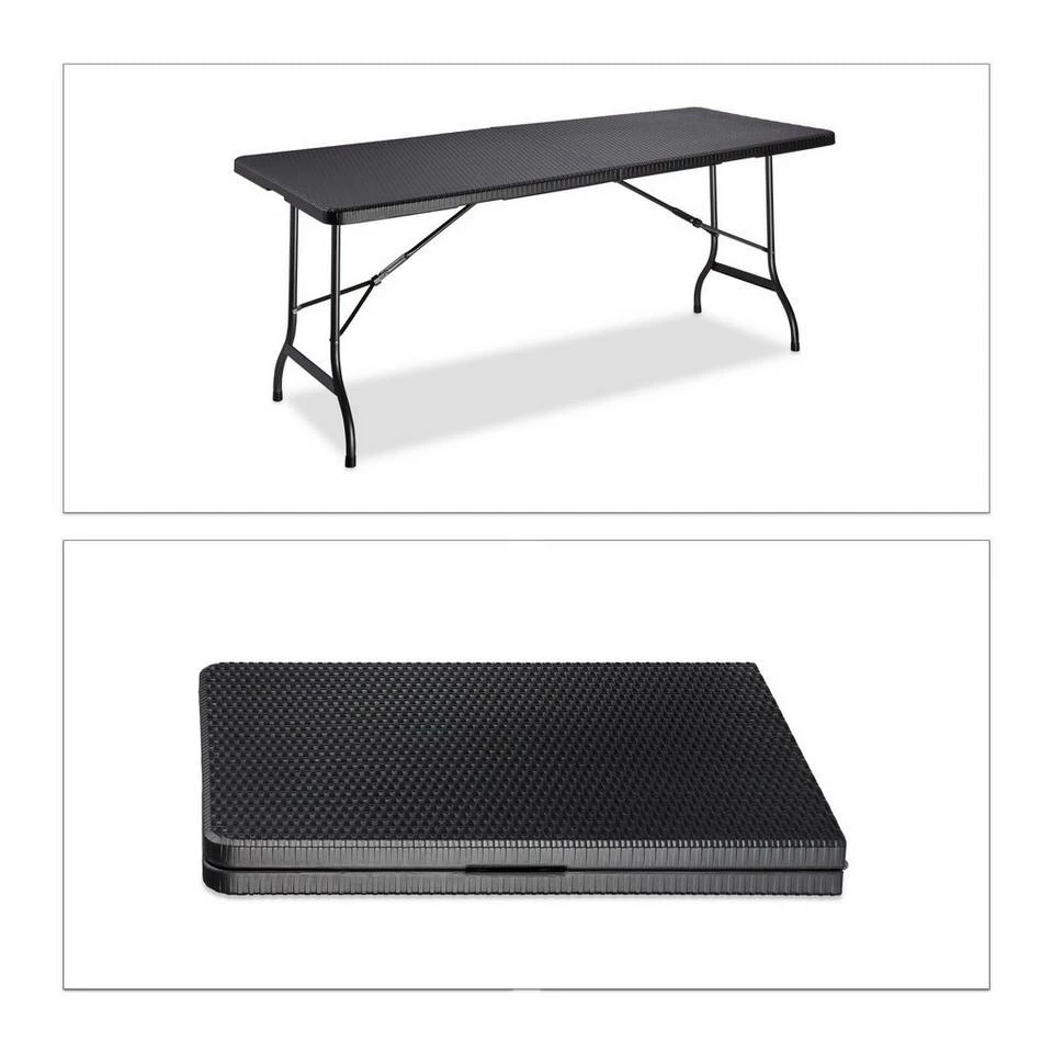 Gartentisch klappbar BASTIAN in Rattan-Optik Der große Gartentisch besteht aus Stahl und Kunststoff, sodass er sich sowohl für den Indoor- als auch Outdoor-Bereich eignet. Er dient als Ess- und Campingtisch, kann aber auch als Ablagemöglichkeit an das Buffet gestellt werden. An dem Gartentisch finden mindestens 8 Personen Platz. Aufgrund seiner Faltfunktion lässt er sich schnell auf- und wieder abbauen. Ein installierter Tragegriff erleichtert seinen Transport. Nach Gebrauch können Sie ihn platzsparend im Keller oder unter dem Bett verstauen.