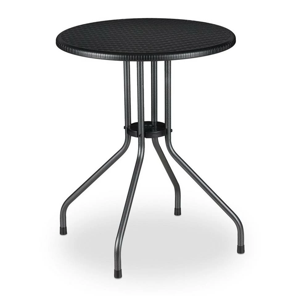 Kleiner Rundtisch in Schwarz Mit dem Kunststofftisch holen Sie sich einen echten Allrounder nach Hause. Ob als Gartentisch, Balkontisch, Bistrotisch oder Grilltisch, der Beistelltisch bietet viele Einsatzmöglichkeiten. Die runde Tischplatte in charmanter Rattan-Optik ist wetterfest und pflegeleicht. Sie kann problemlos mit einem feuchten Lappen gereinigt werden. Der Aufbau des Teetischs erfolgt dank beiliegendem Montagematerial schnell und problemlos. Hinweise: Den Tisch nicht zu lange starker Sonneneinstrahlung aussetzen.