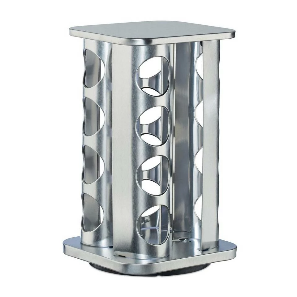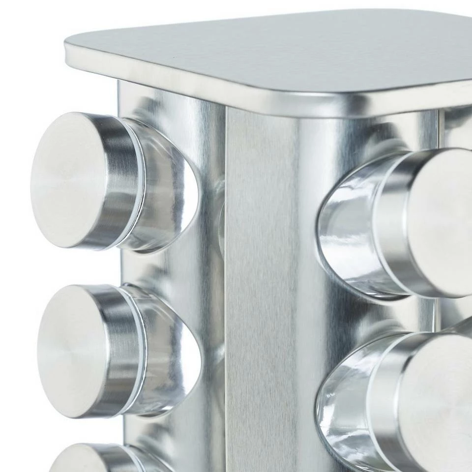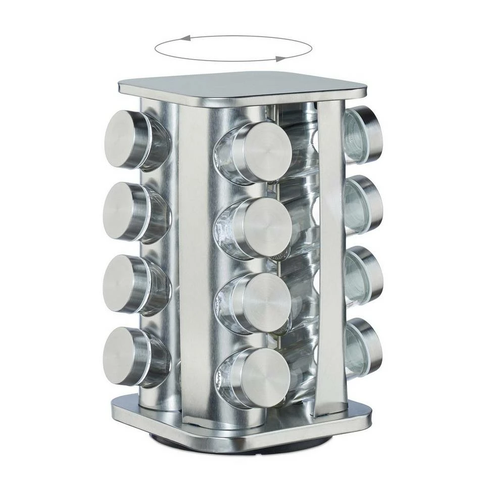 Gewürzglas Halter mit 4 Etagen Köstliche Gewürze verleihen vielen Gerichten erst ihren besonderen Charme. Das moderne Gewürzkarussell aus mattem Edelstahl sorgt dafür, dass Ihnen die Zubereitung dieser kulinarischen Wohltaten leicht und locker von der Hand geht. Dank der Scheibe auf der Unterseite lässt sich das Gewürzregal vollständig drehen. Die 16 Gewürzgläser ermöglichen nicht nur den schnellen Überblick über Pfeffer, Zimt und Co., sondern eignen sich aufgrund ihrer Einsätze auch zum Streuen.