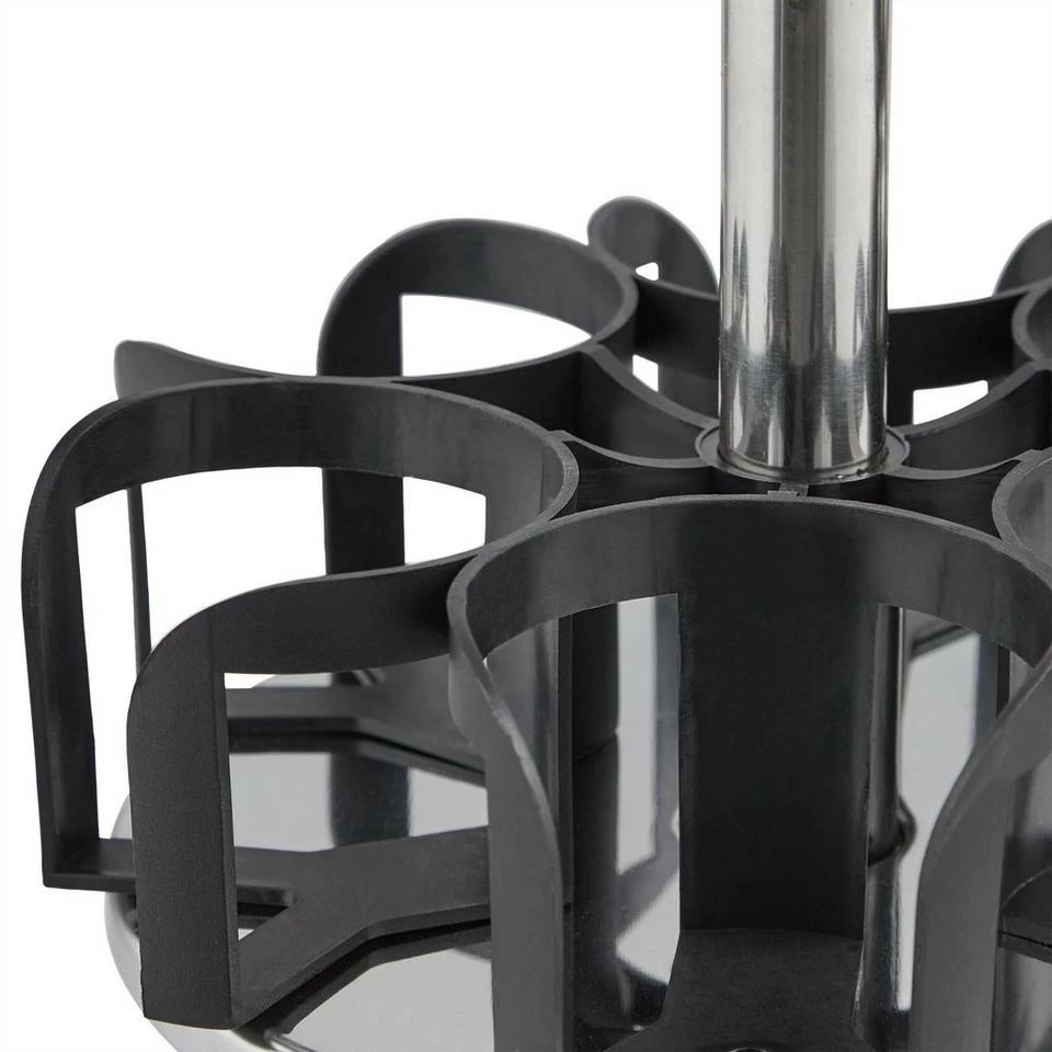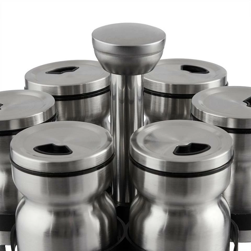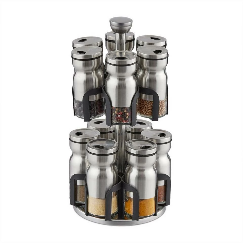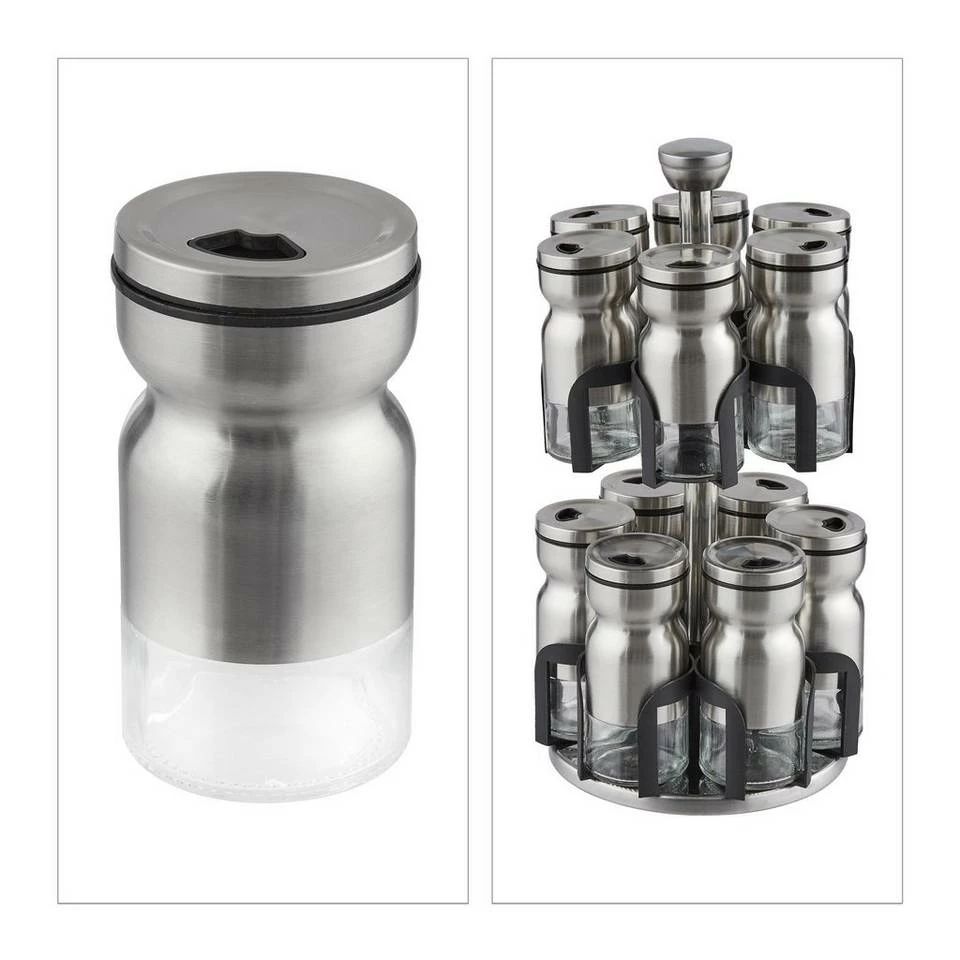 Drehbares Gewürzrondell Sorgen Sie mit dem Gewürzrondell für Ordnung in Ihrer Gewürzsammlung in der Küche. In den 12 Gläsern haben Sie Salz, Pfeffer, Curry, Zimt und mehr immer griffbereit beim Kochen. Durch die 2 verschieden großen Streuöffnungen und die Schüttöffnung können Sie die Gewürze dabei nach belieben portionieren. Drehen Sie das Rondell, um das gewünschte Glas zu entnehmen. Das edle Design aus Edelstahl und schwarzem Kunststoff macht dabei auf jeder Küchen-Arbeitsfläche eine gute Figur.