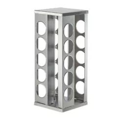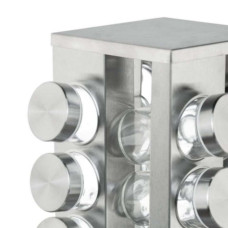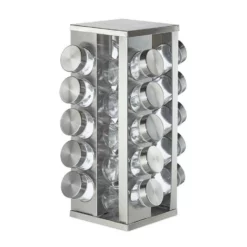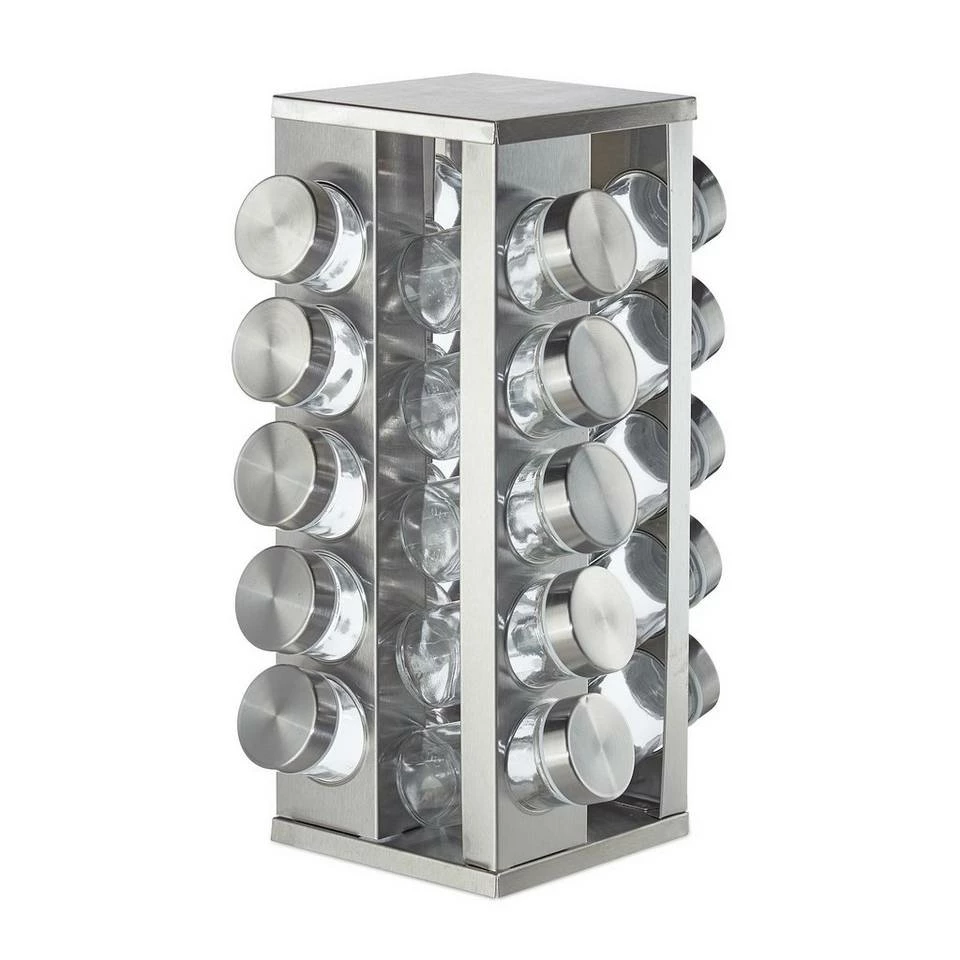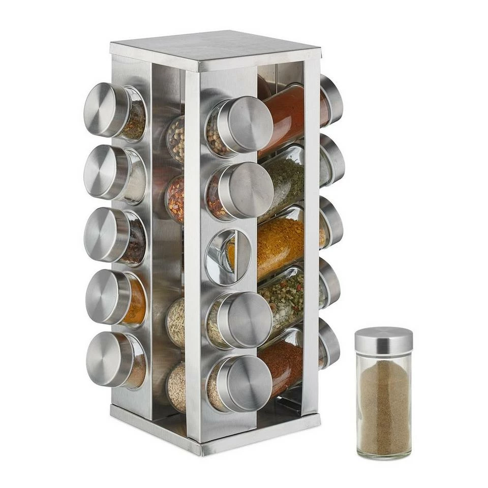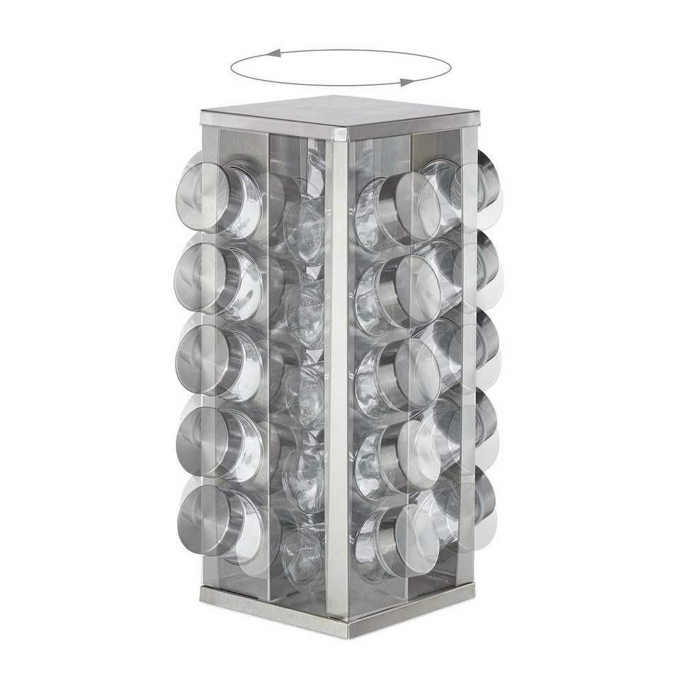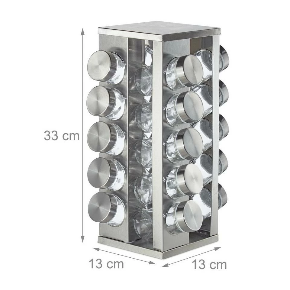 XXL Gewürzrondell mit 20 Gewürzgläsern Sie kochen gerne ausgefallen und brauchen mehr Gewürze in der Küche als Salz und Pfeffer? Dann ist ein Gewürzkarussell die optimale Lösung. Die 20 Gewürzstreuer sind übersichtlich und gut erreichbar in dem drehbaren Gewürzregal angeordnet. Auf 5 Ebenen können Sie Ihre Gewürze unterbringen. Durch die aromadichten Deckel bleiben Ihre Kräuter in den Gewürzbehältern auch lange frisch. Das eckige Design in Silber ist vor allem für moderne Küchen eine schicke Ergänzung.