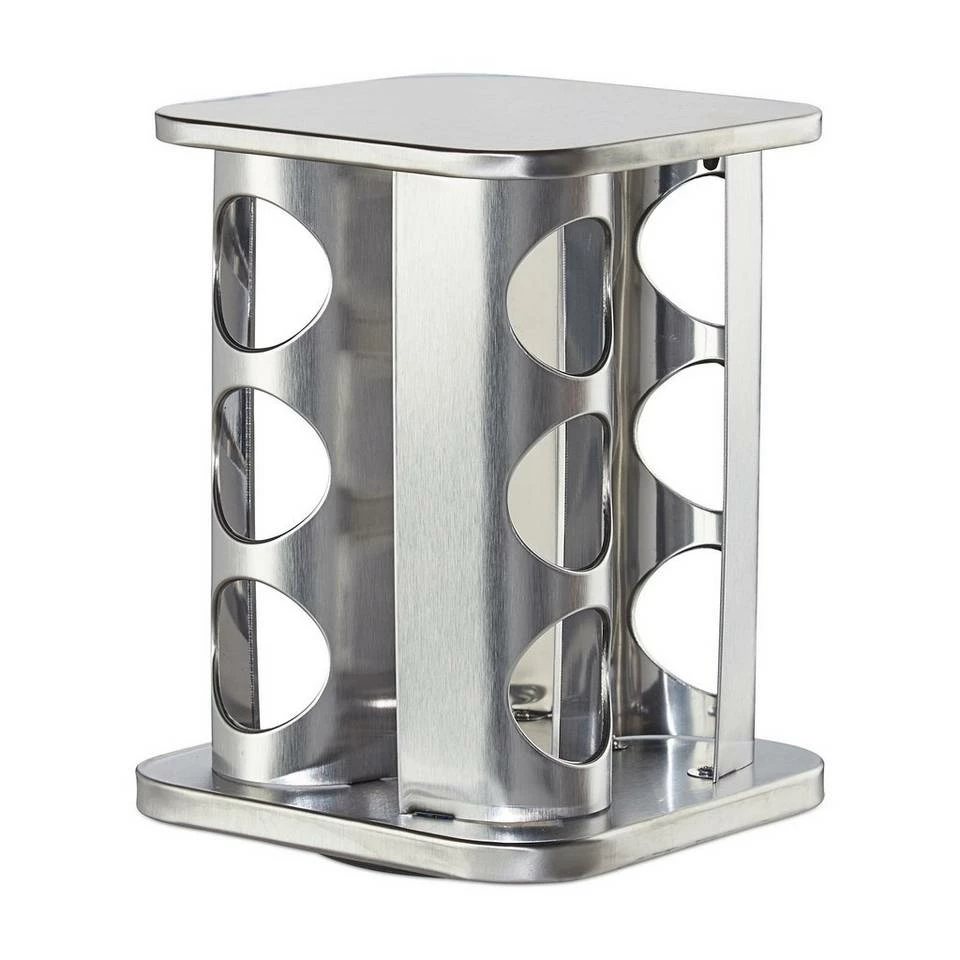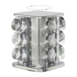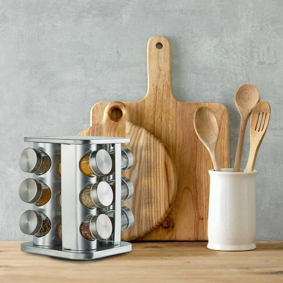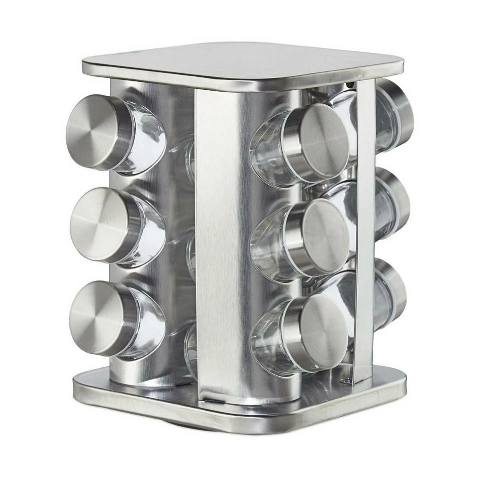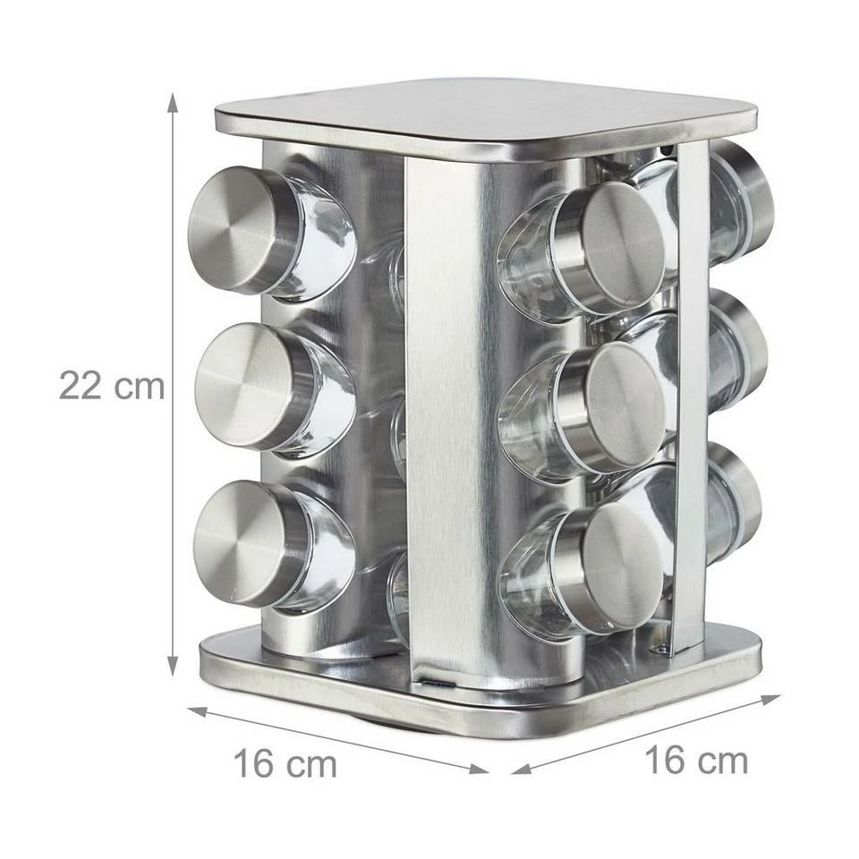 Gewürzrondell mit 12 Gewürzstreuern Wer gerne kocht, weiß auch wie wichtig die richtige Würze ist. Mit dem Gewürzregal aus mattem Edelstahl haben Sie nicht nur einen Blickfang in der Küche, sondern auch den idealen Küchenhelfer, um Ihre Gewürze schnell parat zu haben. Das 360 Grad drehbare Gewürzrondell ermöglicht es, alle Gewürzstreuer schnell zu erreichen. Dank der klaren Gläser wissen Sie, wann ein Gewürz zur Neige geht, ohne beim Sonntagsessen ohne Salz dazustehen. Die aromadichten Verschlüsse halten Ihre Gewürzauswahl frisch.