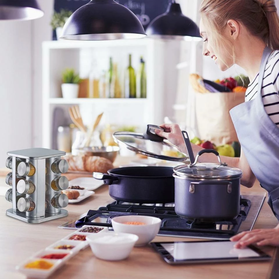 - Praktisch: Komplett drehbarer Gewürzständer – Alle Streuer beim Kochen und am Esstisch griffbereit