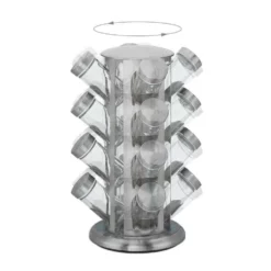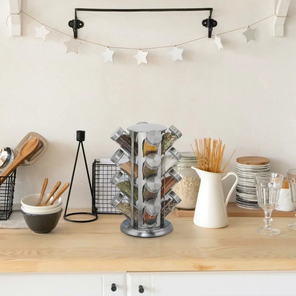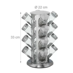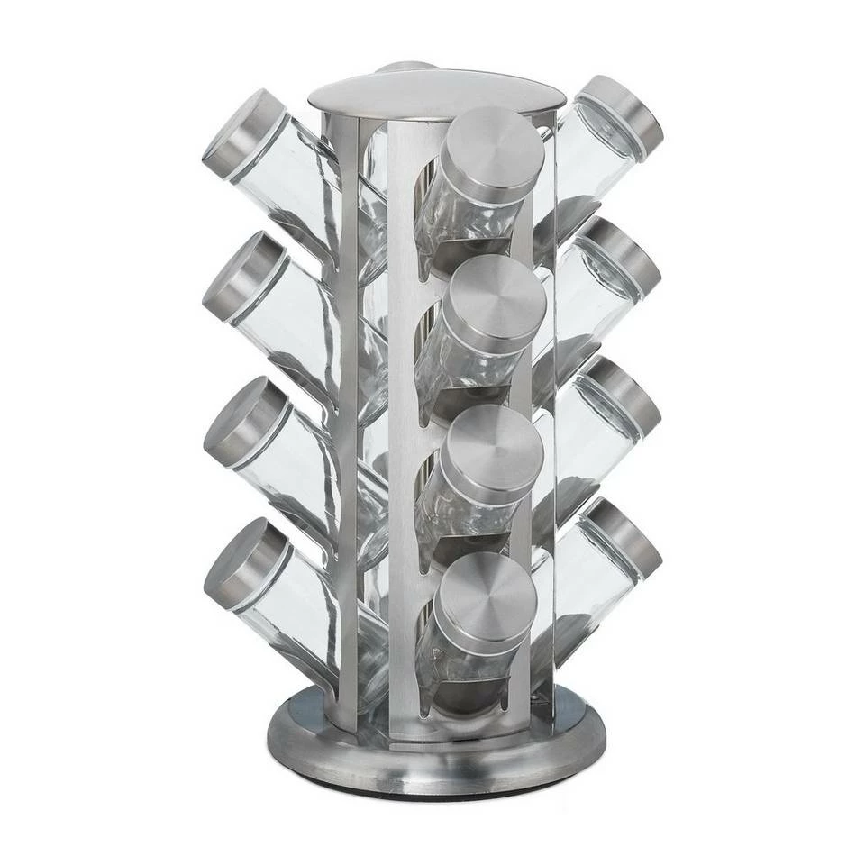 Rundes Kräuterkarussell zur Gewürzaufbewahrung Dieses praktische Gewürzkarussell darf in keiner Küche fehlen. In den 16 Gewürzgläsern mit Schraubdeckel bewahren Sie Gewürze und Kräuter griffbereit und aromadicht auf. Die Gläser verfügen zudem über einen Streueinsatz, sodass sie am Esstisch direkt als Gewürzstreuer verwendet werden können. Dank der Drehscheibe am Boden des Gewürzregals ist jedes gewünschte Gewürz ohne langes Suchen schnell verfügbar. Die moderne Optik fügt sich hervorragend in jede Küche ein.
