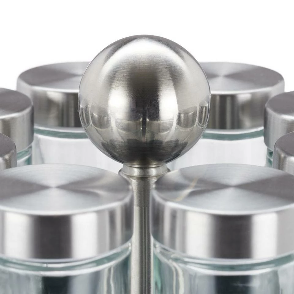 Gewürzregal aus Edelstahl Dieser edle Gewürzorganizer ermöglicht eine übersichtliche Aufbewahrung von Kräutern und Gewürzen. Die 360° Drehbarkeit sorgt dafür, dass die Gewürzbehälter immer griffbereit und ordentlich im Gewürzkarussell stehen. Das Drehen und Tragen des rotierenden Gewürzregals wird durch einen praktischen Edelstahlknauf erleichtert. Dank nützlichem Streueinsatz fungieren die Gläser auch als Gewürzstreuer und bewahren den Inhalt dank Schraubdeckel aromadicht auf. Das schlichte Design des Gewürzrondells fügt sich stilvoll in jede Küche ein.