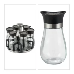 Drehbarer Gewürzständer Dieses stillvolle Gewürzkarussell eignet sich ideal zur Aufbewahrung von Kräutern und Gewürzen. Die komplette Drehbarkeit des Gewürzregals sorgt dafür, dass Ihnen Gewürzbehälter stets griffbereit und übersichtlich zur Verfügung stehen. Das Gewürzdrehregal ist mittig mit einem praktischen Edelstahlknauf versehen, der das Drehen und Tragen erleichtert. Dabei fungieren die bauchigen Gläser dank ihres Streueinsatzes auch als Gewürzstreuer. Der rotierende Gewürzorganizer aus mattem Edelstahl und schwarzem Kunststoff ist eine praktische Ergänzung für jede Küche.