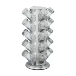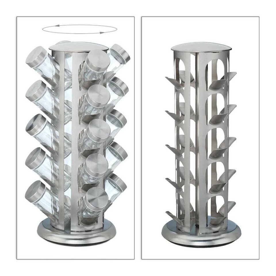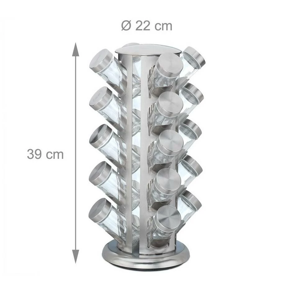 Großes Gewürzrondell mit 20 Gewürzgläsern Mit diesem eleganten Gewürzkarussell bringen Sie mehr Ordnung und Übersicht in Ihre Gewürzsammlung. In 20 Gewürzgläsern verwahren Sie Paprika, Curry, Pfeffer und mehr vor Feuchtigkeit geschützt und aromadicht. Der Gewürzständer ist komplett drehbar, sodass Sie gewünschte Kräuter und Gewürze schnell zur Hand haben. Der aus Edelstahl gefertigte Gewürzhalter überzeugt mit seinem modernen Design, das sich dekorativ auf der Küchenzeile einfügt.