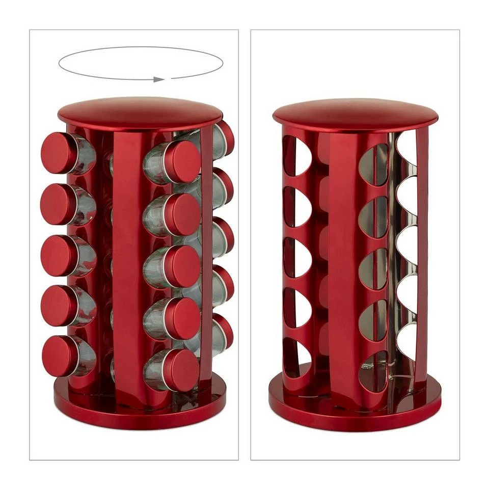 Drehbarer Gewürzständer für die Küche Mit diesem eleganten Gewürzrondell auf Ihrem Esstisch haben Sie die passenden Gewürze zum Verfeinern Ihrer Speisen jederzeit griffbereit. Auch auf der Küchenzeile ist der runde Gewürzturm in glänzendem Rot ebenso praktisch wie ein optisches Highlight. Das Gewürzgläser-Regal ist um 360 Grad drehbar und bietet somit jederzeit guten Überblick sowie leichten Zugriff auf die einzelnen Gläser. Mit 20 Gewürzdosen haben Sie dabei ausreichend Stauraum für Ihre Gewürzsammlung von B wie Bärlauch bis P wie Piment.