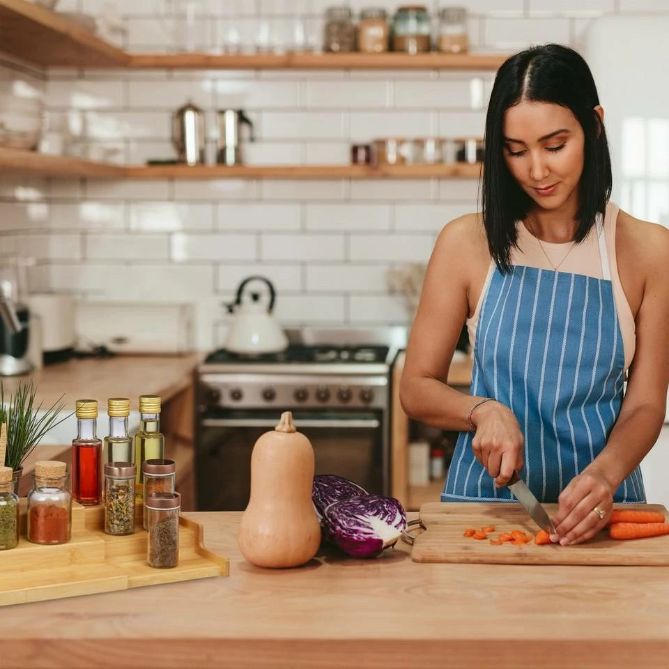Ausziehbare Gewürztreppe mit 3 Stufen Das Gewürzregal wird schnell zu klein, wenn man sich ein paar außergewöhnliche Kräuter oder Gewürzmischungen zulegt. Die Gewürztreppe mit 3 Ebenen bietet nicht nur in der Höhe Stauraum, sondern auch in der Breite. Das flexible Gewürzküchenregal kann nämlich ganz leicht vergrößert werden. Einfach ausziehen und schon haben sie zusätzlichen Platz. Sorgen Sie mit dem Organizer für den richtigen Überblick beim Würzen. Das Regal ist komplett aus feuchtigkeitsresistentem Bambus gefertigt.