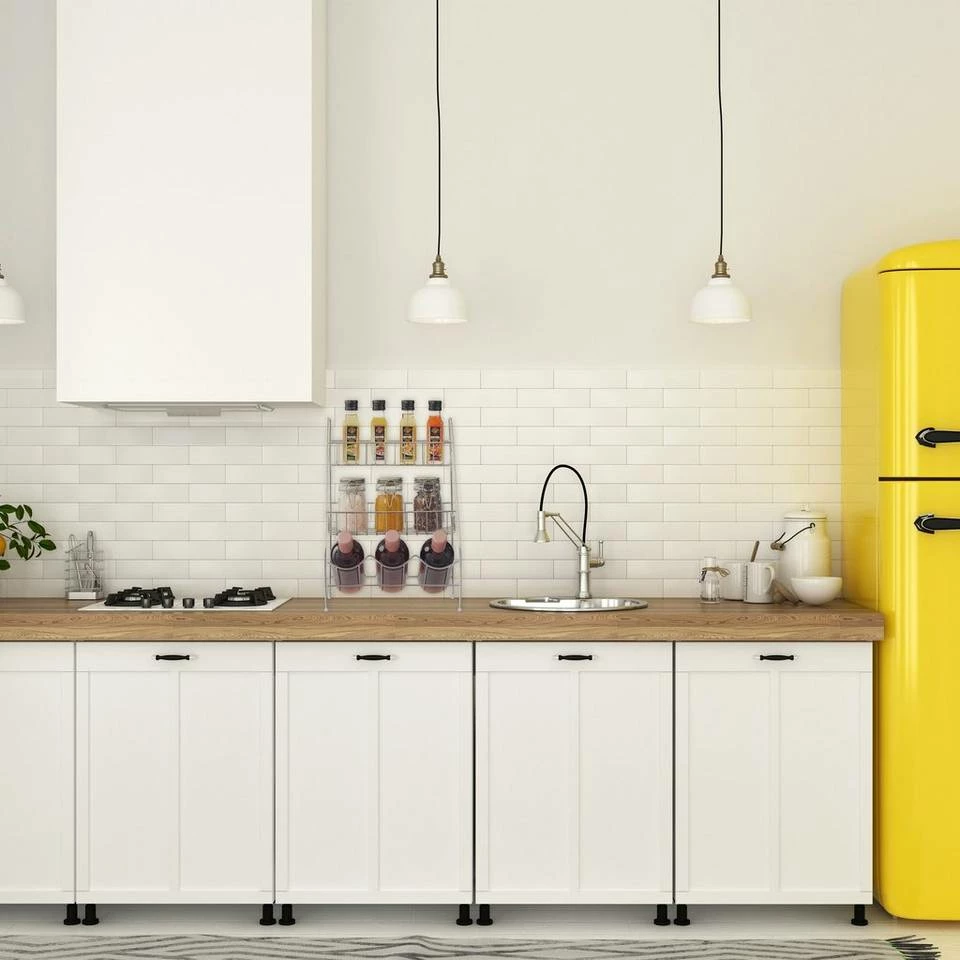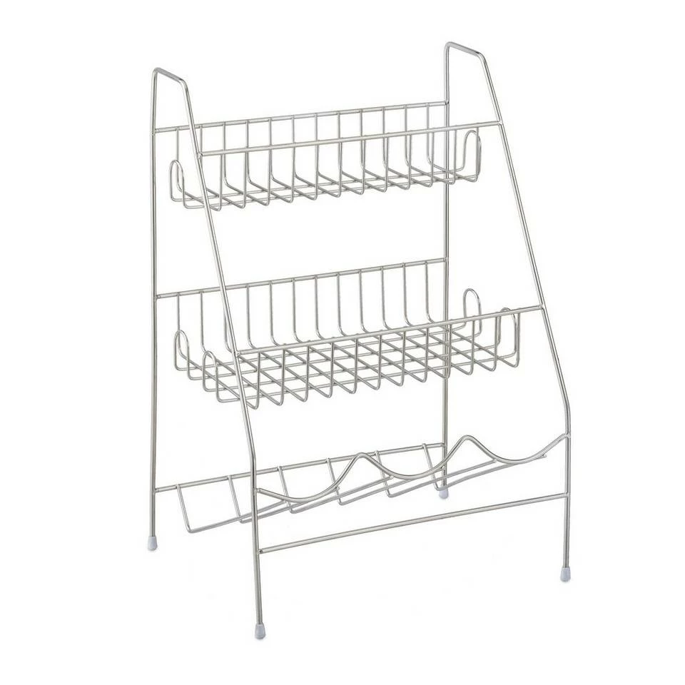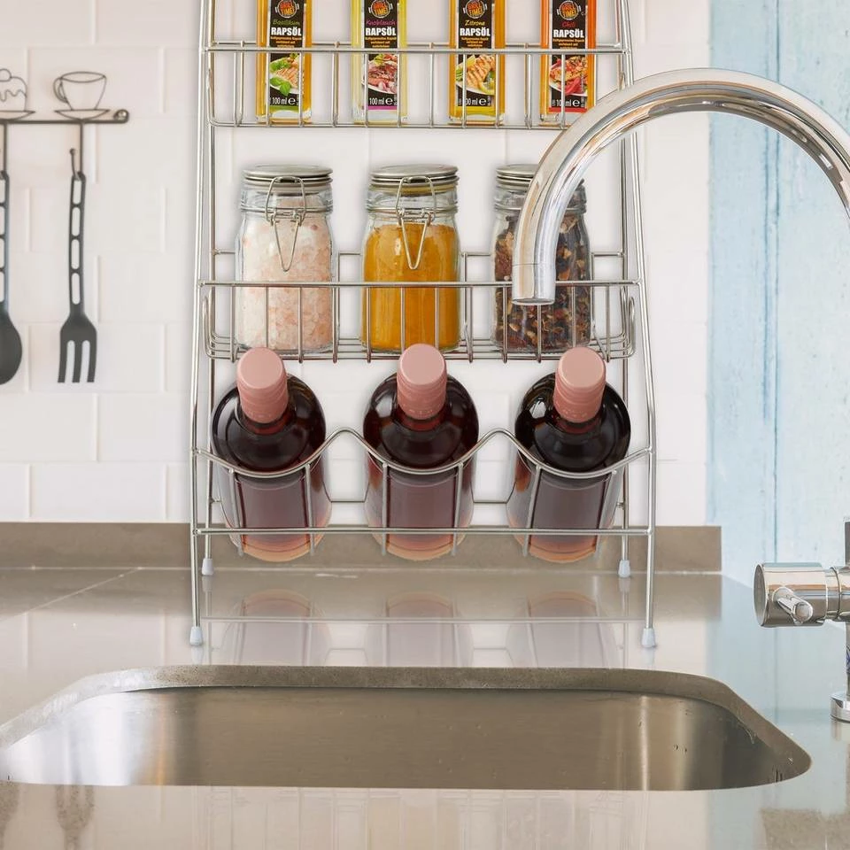 Gewürzhalter freistehend Das praktische Gewürzregal hält auf Ihrer Küchenzeile für Sie Gewürze, Tee und nötige Zutaten bereit, wann immer Sie diese benötigen. Auf der Arbeitsplatte oder im Küchenregal – auf 3 Ebenen wird der vorhandene Platz optimal genutzt und eine gute Übersicht garantiert. Besonders praktisch ist der Flaschenhalter: Bis zu 3 Flaschen können auf der unteren Ebene gelagert werden, damit Sie Öl, Essig und weiteres immer griffbereit haben. Dank des schlichten Designs passt das Kräuterregal in jede Küche.