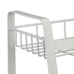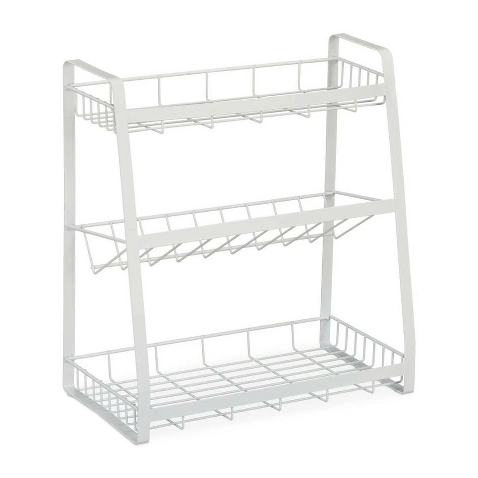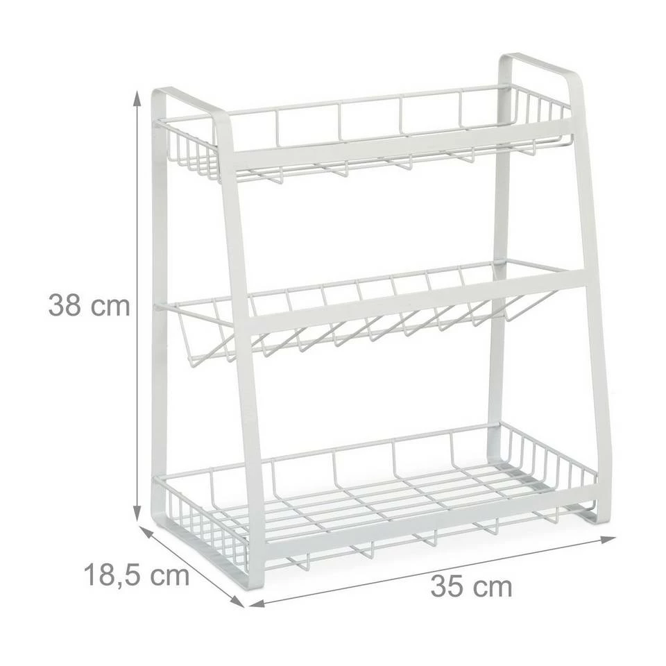 Freistehender Küchen Organizer für Gewürze & Co. Das freistehende Gewürzregal ist der ideale Helfer auf Arbeitsflächen, in Küchenschränken oder -regalen. Die 3 verschiedenen Fächer des Gewürzbords bieten individuellen Stauraum für Gewürzdosen, Kräutertöpfe oder andere trockene Vorräte. Vor allem das mittlere Fach eignet sich mit seiner Neigung ideal für die Lagerung von Flaschen wie Öl und Essig. Dank seines offenen Gitter Designs aus Metall sorgt der weiße Gewürzständer dabei jederzeit für Ordnung und Übersichtlichkeit.