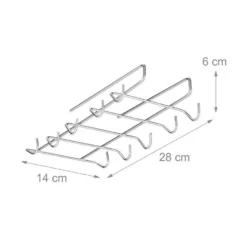 Hängender Kaffeetassenhalter für den Schrank Um den Platz im Küchenschrank optimal auszunutzen, ist dieser Tassenaufhänger perfekt geeignet. Schieben Sie den Schrankeinsatz einfach auf den Regal- oder Schrankboden und hängen Sie an die 10 Haken Teetassen und Kaffeebecher. Zudem können Sie die Tassenaufhängung mit der Halterung zusätzlich im Schrank stabilisieren. Gefertigt aus Edelstahl, fügt sich das silberne Tassen Hängeregal in jede Küche dezent ein.