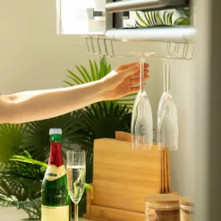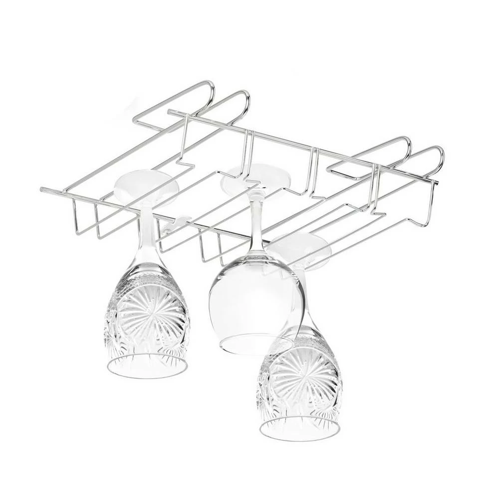 Gläserhalter zum Aufhängen im Schrank Da sich Stielgläser nicht stapeln lassen, nehmen sie oft viel Platz im Schrank in Anspruch, der dann für andere Küchenutensilien fehlt. Hängen Sie Ihre Wein-, Bier- und Sektgläser daher in Zukunft mit der Gläserhalterung kopfüber im Küchenschrank auf und schaffen Sie so zusätzlichen Stauraum. Dafür muss die Weinglasaufhängung aus Metall lediglich am Schrank- oder Regalbrett eingehängt werden und schon können Sie die 4 nebeneinander angeordneten Gläserschienen mit Ihren Stielgläsern bestücken.