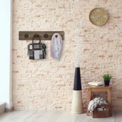 Garderobenhakenleiste aus Holz & Metall Mit dieser rustikalen Wandhakenleiste sorgst Du jederzeit für einen aufgeräumten Eingangsbereich. Die aus Holz und Metall gefertigte Kleiderleiste überzeugt mit ihrem originellen Industrial Stil und wird an jeder Wand zum dekorativen Eyecatcher. 4 Garderobenhaken bieten genügend Platz, um Jacken, Taschen oder Schals griffbereit aufzuhängen. Die Holzhakenleiste eignet sich aber nicht nur für Deine Garderobe im Flur, sondern macht auch als Handtuchhakenleiste in der Küche eine tolle Figur.