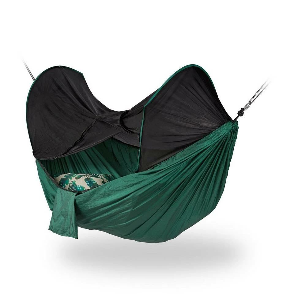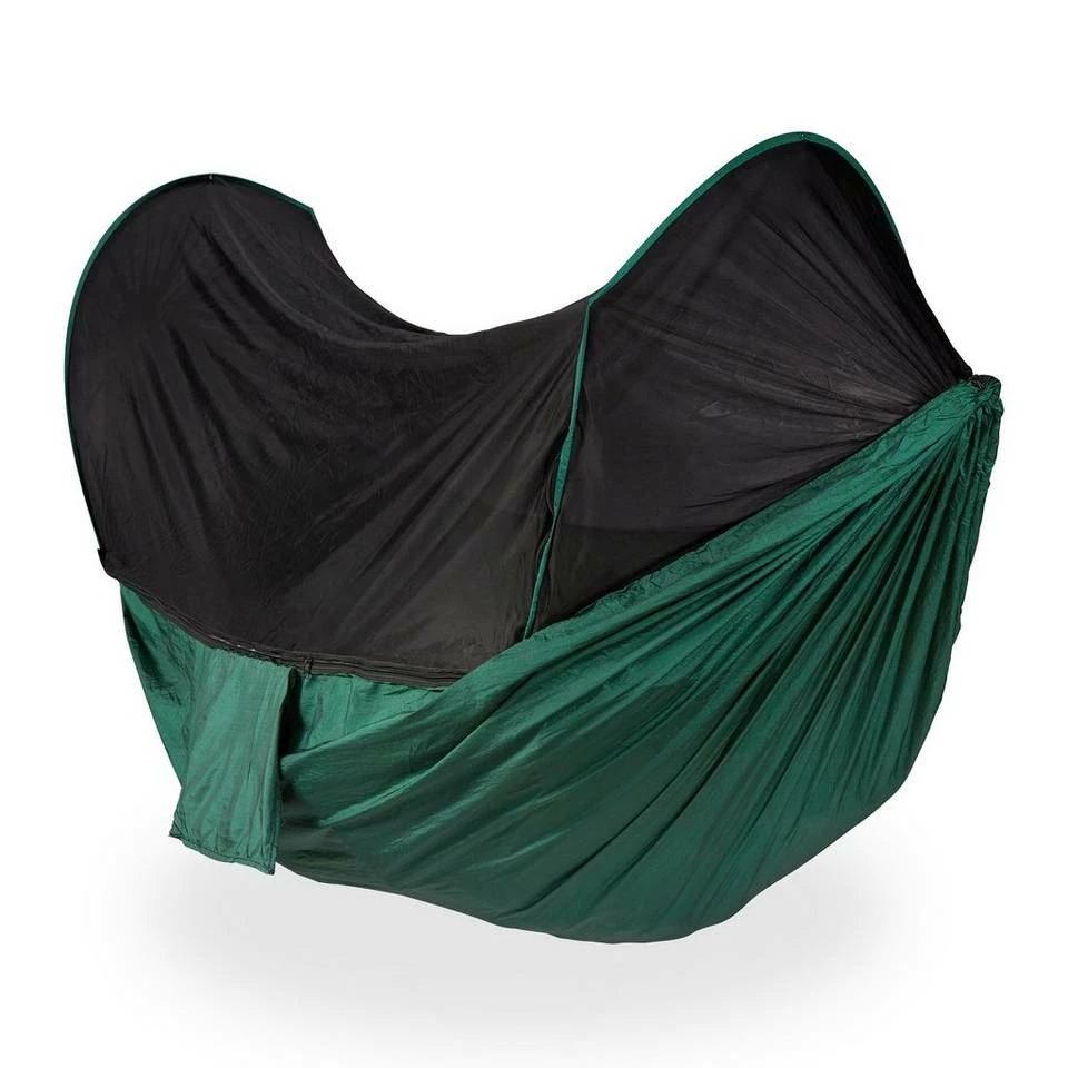 Hängematte mit Moskitonetz Genießen Sie einen erholsamen Schlaf in dieser bequemen Baumhängematte, egal ob im Garten oder auf Reisen. Das integrierte Netz wird von einem Gestell gehalten und bietet Schutz vor Moskitos, Mücken und anderen Insekten. Spannen Sie ihre Hängematte einfach mit den Seilen und Karabinern zwischen zwei Bäumen auf und entspannen Sie sich, während ihre Freunde noch Zelte aufbauen und Schlafsäcke ausrollen müssen. In der angenähten Tragetasche kann das Baumzelt auf geringem Platz verstaut werden und ist unterwegs immer mit dabei. Dank der Konstruktion aus Nylon können Sie sich sorgenlos ausruhen.
