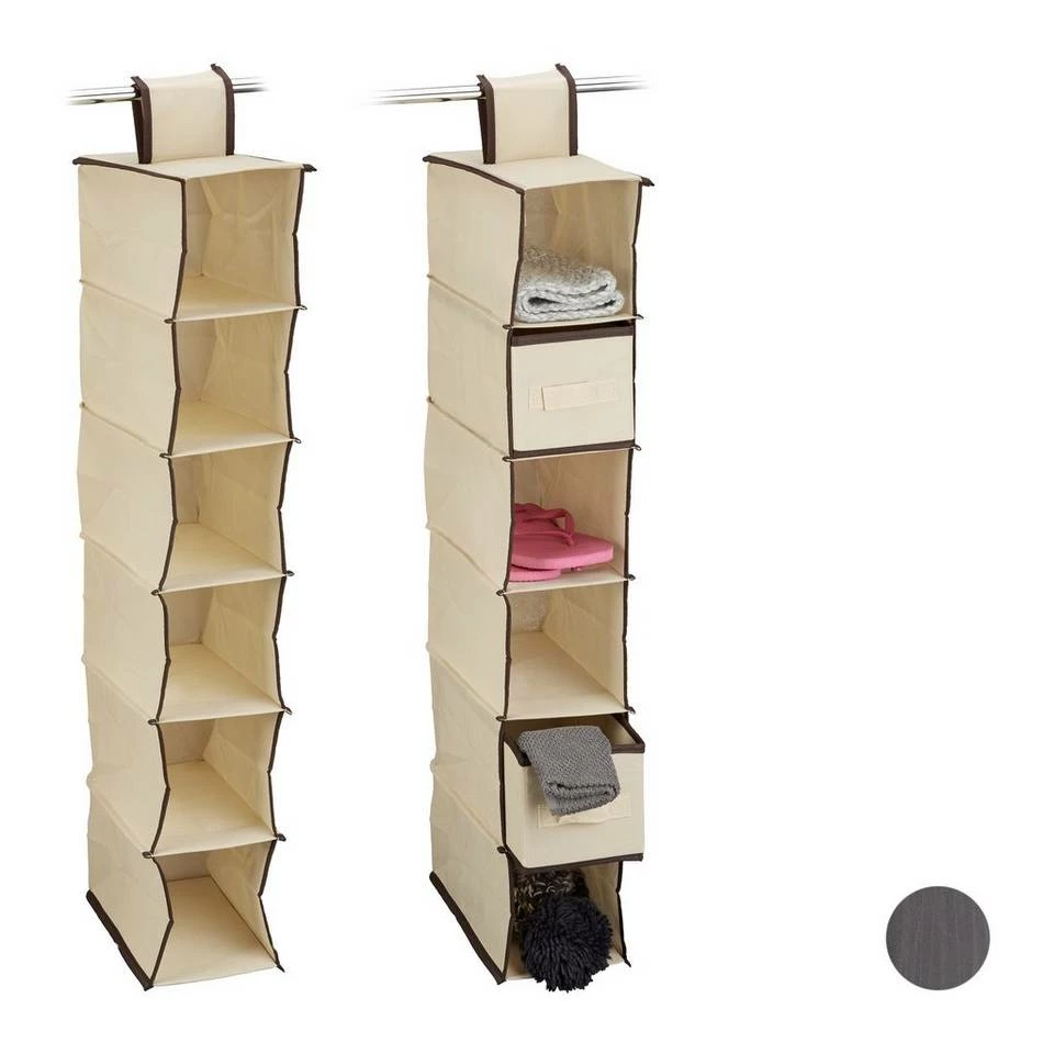 Funktionale Hängeaufbewahrung aus Stoff Das Stoffregal organisiert intelligent die Unordnung in Ihrem Kleiderschrank. Mit dem Klettverschluss passt der Hängeorganizer auf alle Kleiderstangen. Das Vlies-Gewebe ist besonders atmungsaktiv und feuchtigkeitsbeständig. Daher eignet sich auch ein Einsatz im Bad. Das Faltregal bietet mit 6 Fächern und 2 Schubladen genügend Stauraum. Wenn die Hängefächer nicht benötigt werden, falten Sie diese einfach zusammen. Dadurch kann der Organizer auch im Urlaub eine nützliche Ergänzung sein.