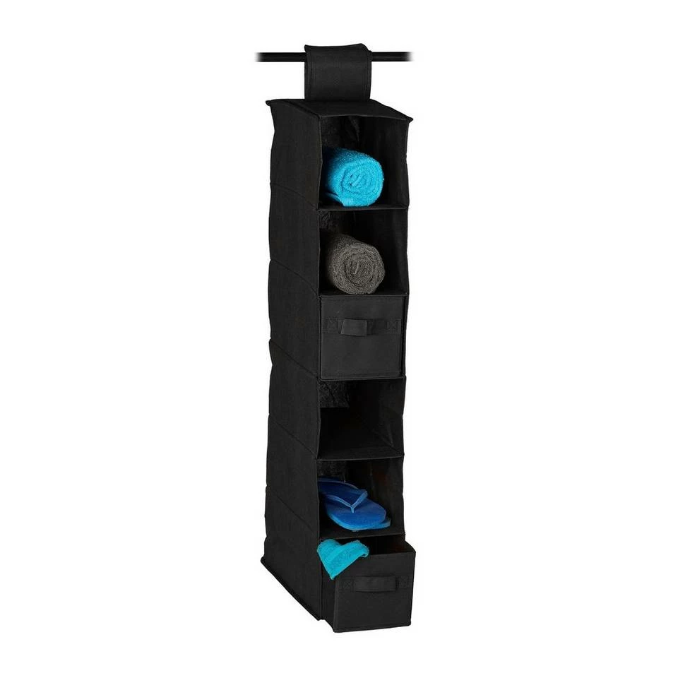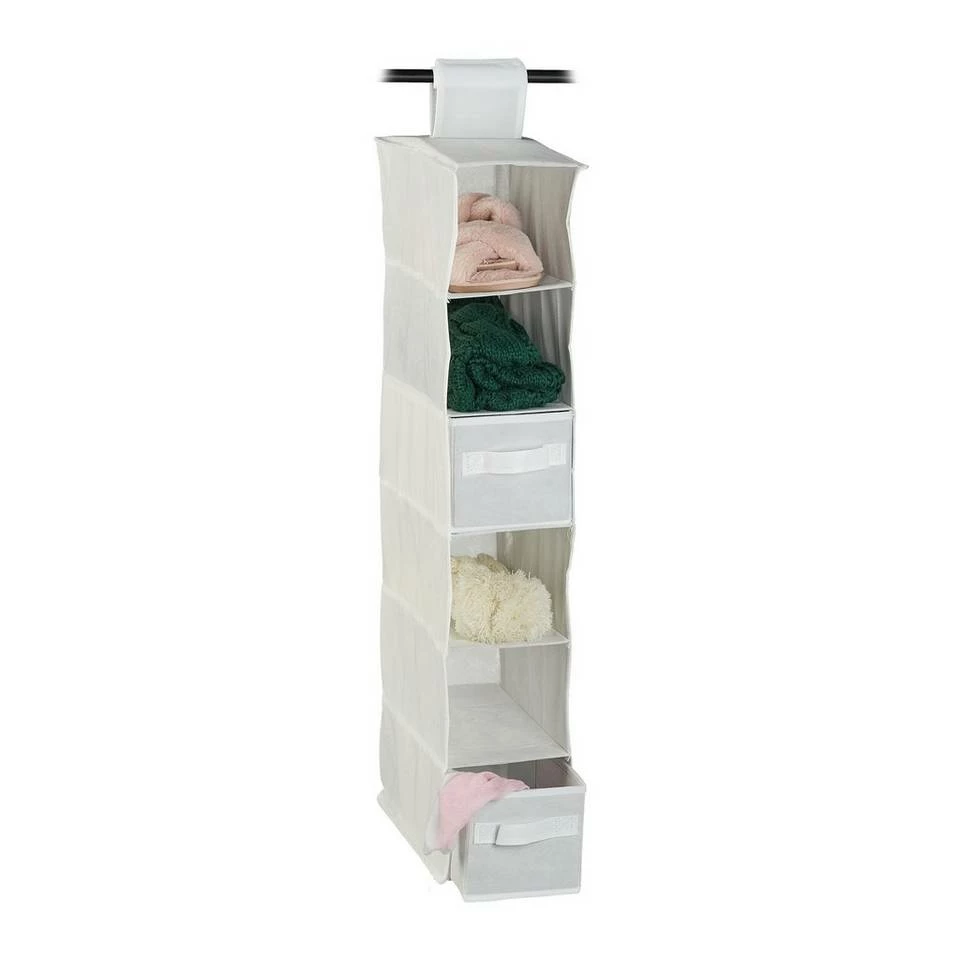 Funktionale Hängeaufbewahrung aus Stoff Das Stoffregal organisiert intelligent die Unordnung in Ihrem Kleiderschrank. Mit dem Klettverschluss passt der Hängeorganizer auf alle Kleiderstangen. Das Vlies-Gewebe ist besonders atmungsaktiv und feuchtigkeitsbeständig. Daher eignet sich auch ein Einsatz im Bad. Das Faltregal bietet mit 6 Fächern und 2 Schubladen genügend Stauraum. Wenn die Hängefächer nicht benötigt werden, falten Sie diese einfach zusammen. Dadurch kann der Organizer auch im Urlaub eine nützliche Ergänzung sein.