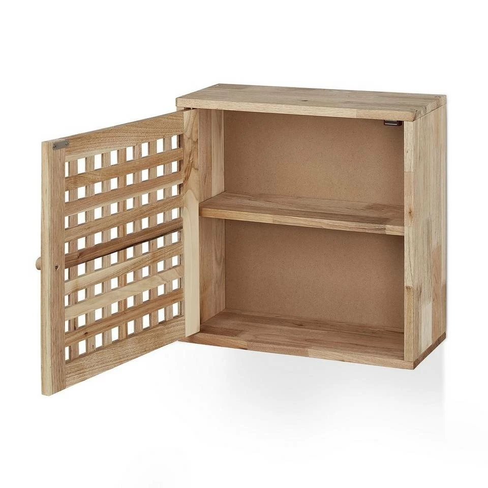 Schmaler Badezimmerschrank aus Holz Der kompakte Badwandschrank mit Tür in dekorativer Gitteroptik ist ideal für kleine Badezimmer oder das Gästebad. Platzsparend und doch geräumig bietet das Badezimmerschränkchen auf 2 Ebenen Platz für Duschbad, Lotionen, Parfums und weitere Badaccessoires. Die Schranktür bleibt dank Magnetverschluss sicher verschlossen. Der Wandschrank aus edlem Walnussholz schafft auch in Flur und Küche praktischen Stauraum.