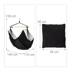 - Basics: Hängesitz Max. Maße H x B x T ca. 135 x 110 x 140 cm – Maße je Kissen B x T: ca. 38 x 38 cm