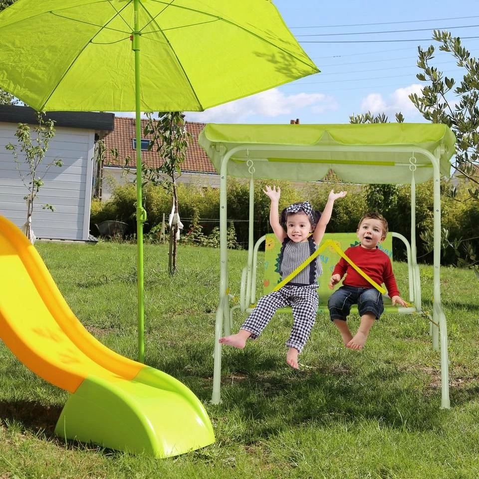 Hollywoodschaukel Zweisitzer für Kinder Die kleine Gartenschaukel für Kinder schenkt Ihren Kleinen eine Verschnaufpause im Schatten, während sie entspannt vor und zurück schwingen. Die robuste Hollywoodschaukel aus Eisen mit neigbarem Sonnendach aus Polyester besticht durch ein kinderfreundliches und farbenfrohes Design. Der 2-Sitzer ist mit Sitzgurten ausgestattet. Für übermütige Schaukler gibt es zwei Sicherheitsgurte am Gestell, welche das Schwingen reduzieren. Die Schaukelbank eignet sich für Garten, Terrasse oder Balkon. Sicherheitshinweis: Lassen Sie Ihr Kind die Schaukelbank nur unter Aufsicht nutzen. Vermeiden Sie zu starkes Schwingen.