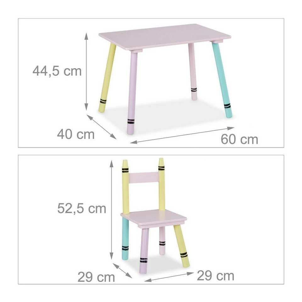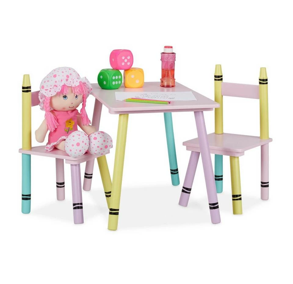 Kindertisch mit Stühlen für Jungen & Mädchen Diese niedliche Kindersitzgruppe ist eine tolle Sitzgelegenheit für das Kinderzimmer. Das 3-teilige Set besteht aus einem Kindertisch und 2 Stühlen. Lass Deine Kleinen selbstständig an dem geräumigen Basteltisch malen, spielen oder essen. Dank der niedrigen Sitz- und Tischhöhe können 2 Kinder bequem auf der Kinder-Sitzgarnitur Platz nehmen und sich wie die Großen fühlen. Die robuste Kindersitzecke überzeugt dabei mit ihrem farbenfrohen Wachsmalstift-Design, das Kinderaugen zum Strahlen bringt.