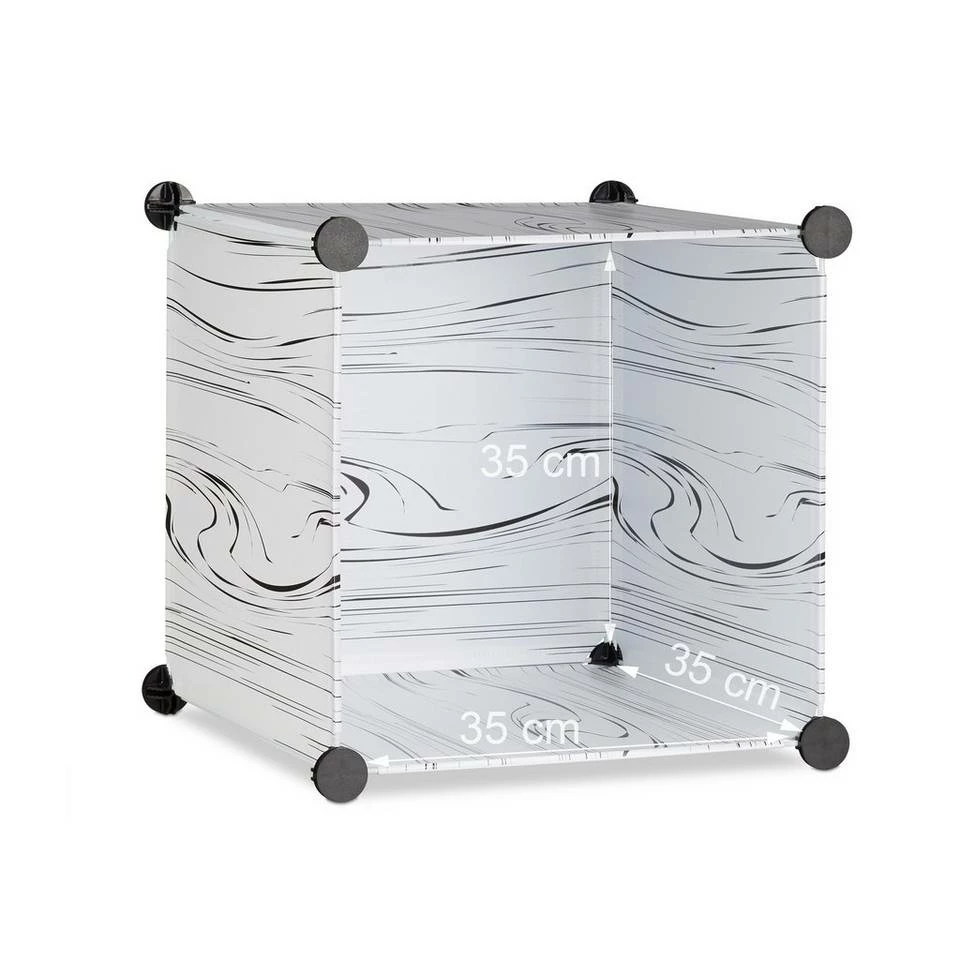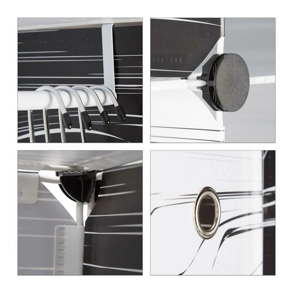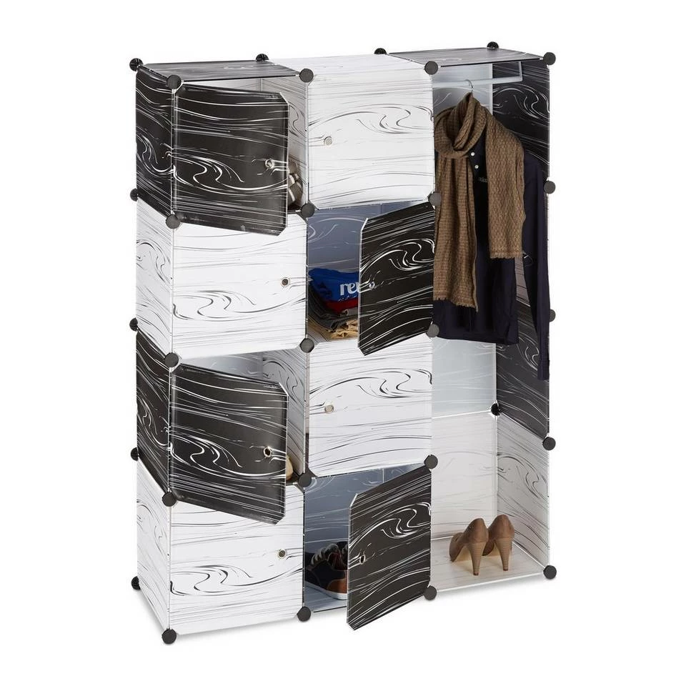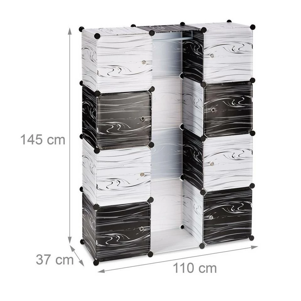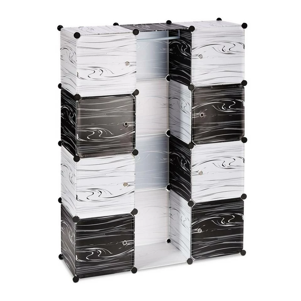 Schwarz-weißer Kleiderschrank mit Stecksystem Gerade für junge Leute, die öfter mal umziehen, ist ein starrer Kleiderschrank, der für die neue Wohnung vielleicht zu groß oder zu hoch ist, weniger praktisch. Dieses Schranksystem ist flexibel und kann einfach und unkompliziert angepasst werden. Durch das praktische Stecksystem kann der Schlafzimmerschrank über die Verbindungsstücke aus Kunststoff beliebig erweitert oder verkleinert werden. Die weißen und schwarzen Teile sind jeweils mit einem dekorativen Holzmuster verziert und können je nach Geschmack angeordnet werden.