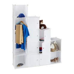 Kleiderschrank Stecksystem mit viel Stauraum Dieses flexible Steckregal ist genau das Richtige, wenn Sie gerne mal die Möbel verrücken wollen oder eine flexible Aufbewahrungsmöglichkeit suchen. Sie können durch die Kleiderstange eine offene Garderobe bauen oder ein Würfelregal mit bis zu 12 Fächern. Ganz ohne Bohren und Schrauben gelingt der Aufbau. Als Kleiderschrank mit Türen im Schlafzimmer oder offener Raumteiler im Wohnzimmer wirkt die schlichte Aufbewahrungsmöglichkeit nie fehl am Platz. Der Kunststoff lässt sich einfach mit einem feuchten Tuch säubern. Hinweis: Aufbau bei Raumtemperatur durchführen, um Biegsamkeit der Verbindungsstücke zu gewährleisten