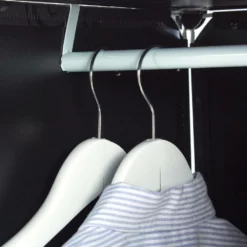 - Stauraum: Würfelregal mit 8 Fächern hinter 12 Türen – 2 Kleiderstangen für Taschen, Schals und Bügel
