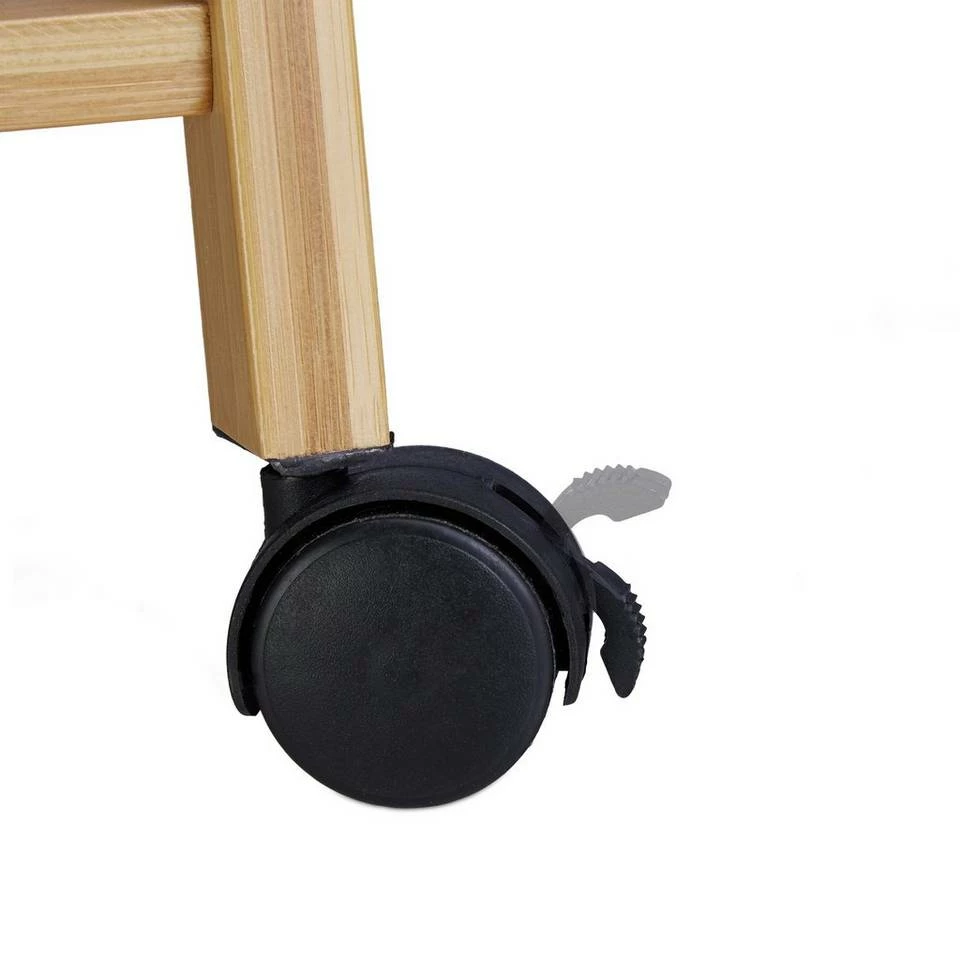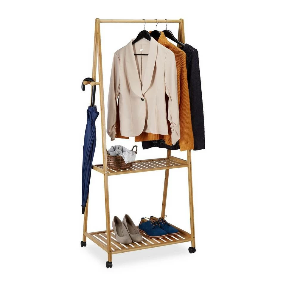 Praktische Rollgarderobe aus Bambus Mit der rollbaren Garderobe bewahren Sie Ihre Kleidung ordentlich sortiert auf – ob im Flur, Büro oder Schlaf- und Ankleidezimmer. Die lange Kleiderstange bietet ausreichend Platz, um Hemden, Blusen oder Jacken an Kleiderbügeln aufzuhängen. Auf den 2 Ablagen platzieren Sie Schuhe und Stiefel oder bewahren Ihre Schals und Tücher gefaltet in Boxen auf. Handtaschen können bequem an den 4 Haken verstaut werden. Durch die natürlich warme Optik ist der Garderobenwagen in jeder Wohnung ein Hingucker.