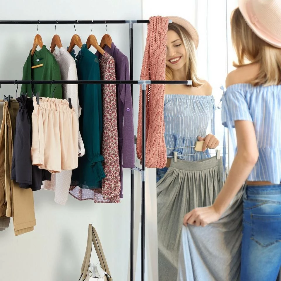 Doppelkleiderständer mit Stangen und Ablagen Mit diesem Klamottenständer aus Metall schaffen Sie innerhalb kürzester Zeit neuen Stauraum für Ihre Kleidung. Das Garderobengestell ist dank Stecksystem schnell auf- und abgebaut und kann so sowohl als dauerhafter Kleidungsständer als auch als flexible Übergangslösung eingesetzt werden. Auf 2 Kleiderstangen und 2 Stoffablagen finden Sie ausreichend Platz für Jacken, Hemden, Blusen, Kleider, Schuhe, Taschen und diverse andere Kleidungsstücke.