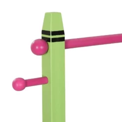 Farbenfrohe Kleiderablage für Kinderkleidung Die bunte Kleidergarderobe ist das ideale Möbelstück für das Kinderzimmer, um Kinder- und Babykleidung ordentlich aufzuhängen oder abzulegen. Neben einer Garderobenstange und 4 Kleiderhaken für Jäckchen, Kleidchen oder Shirts verfügt das Kleidergestell auch über 2 Ablagen. Hier finden zum Beispiel Hosen, Mützen oder Hausschuhe einen Platz. Dank der kindgerechten Größe der Standgarderobe können Deine Sprösslinge ihre Kleidung selbstständig aufräumen und so ganz nebenbei lernen, Ordnung zu halten.