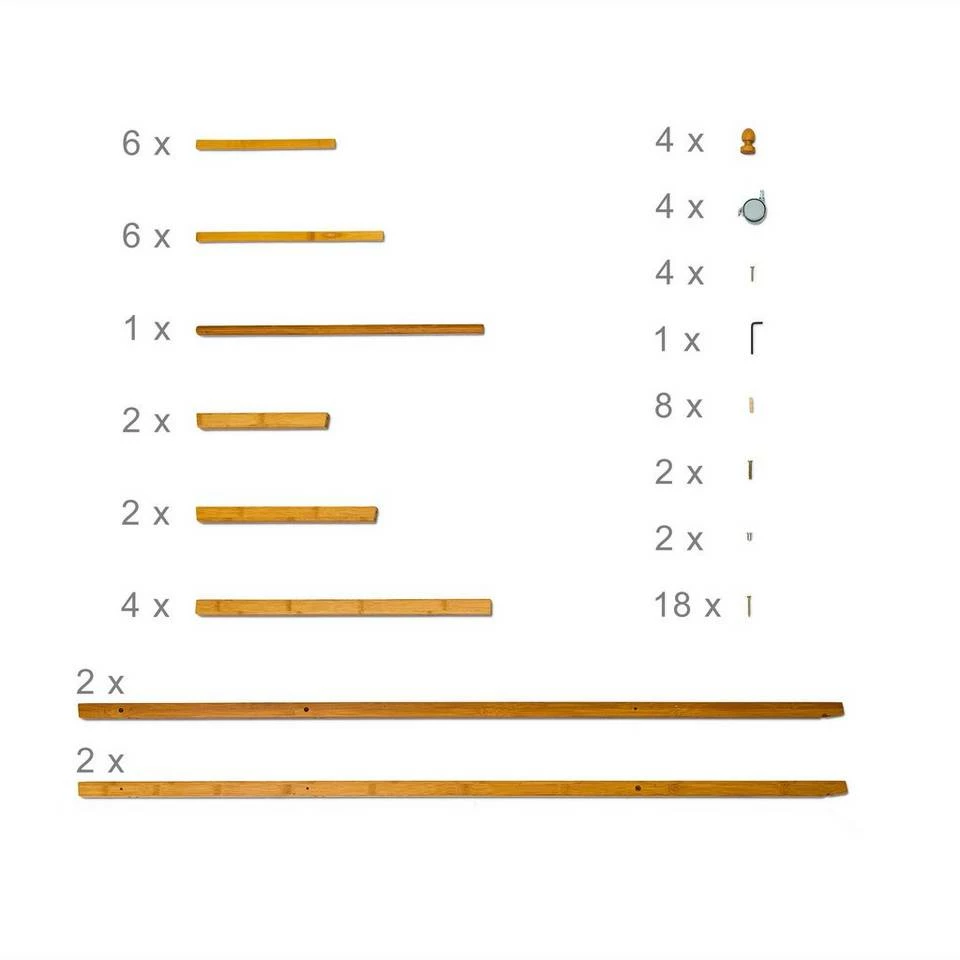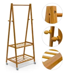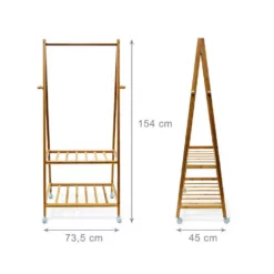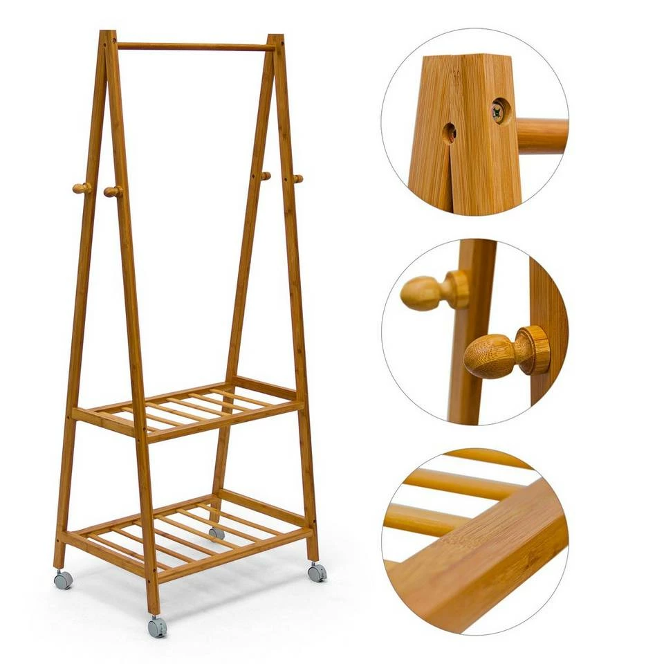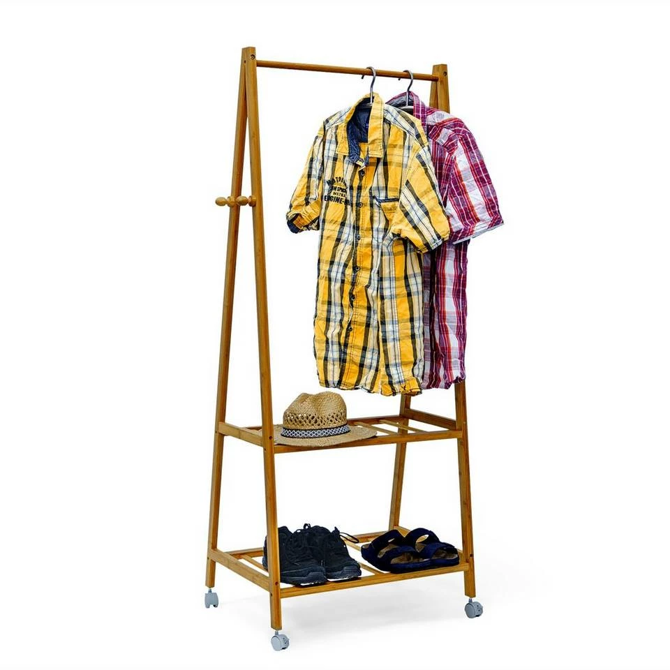 Dieser Kleiderständer schafft Ordnung in Ihrem Flur Der Garderobenständer ist sehr robust und kratzfest aus Bambus gefertigt. Die Naturbelassenheit des Materials strahlt eine schlichte Schönheit aus, die jedem Flur gut zu Gesicht steht. Die elegante, nach oben hin spitz zulaufende Form der Standbeine ist platzsparend und bietet großzügigen Stauraum für Ihre Jacken, Anzüge uvm. Der Kleiderständer verfügt zudem über 2 Ablageflächen für Ihre Schuhe, von denen die obere auch gut für Stiefel und höhere Schuhe geeignet ist. Durch die 4 Rollen ist die Garderobe sehr leicht bewegbar und steht damit immer am idealen Ort.