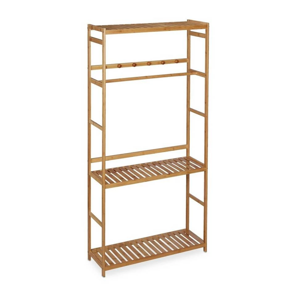 Kleidungsständer für Flur & Schlafzimmer Die Standgarderobe aus Bambus sorgt für einen aufgeräumten Eingangsbereich, in dem Schuhe, Jacken oder Taschen ihren festen Platz finden. Dafür halt die Garderobe 3 Ablagen, eine Kleiderstange und 6 Haken bereit, wobei Sie die Position jeweils flexibel bestimmen und so an Ihre individuellen Bedürfnisse anpassen können. Aber nicht nur im Flur, auch als kleiner offener Kleiderschrank im Schlafzimmer oder Ankleidezimmer macht der freistehende Klamottenständer eine ausgezeichnete Figur.