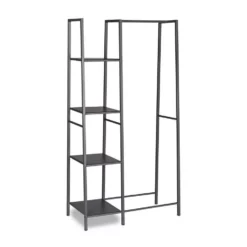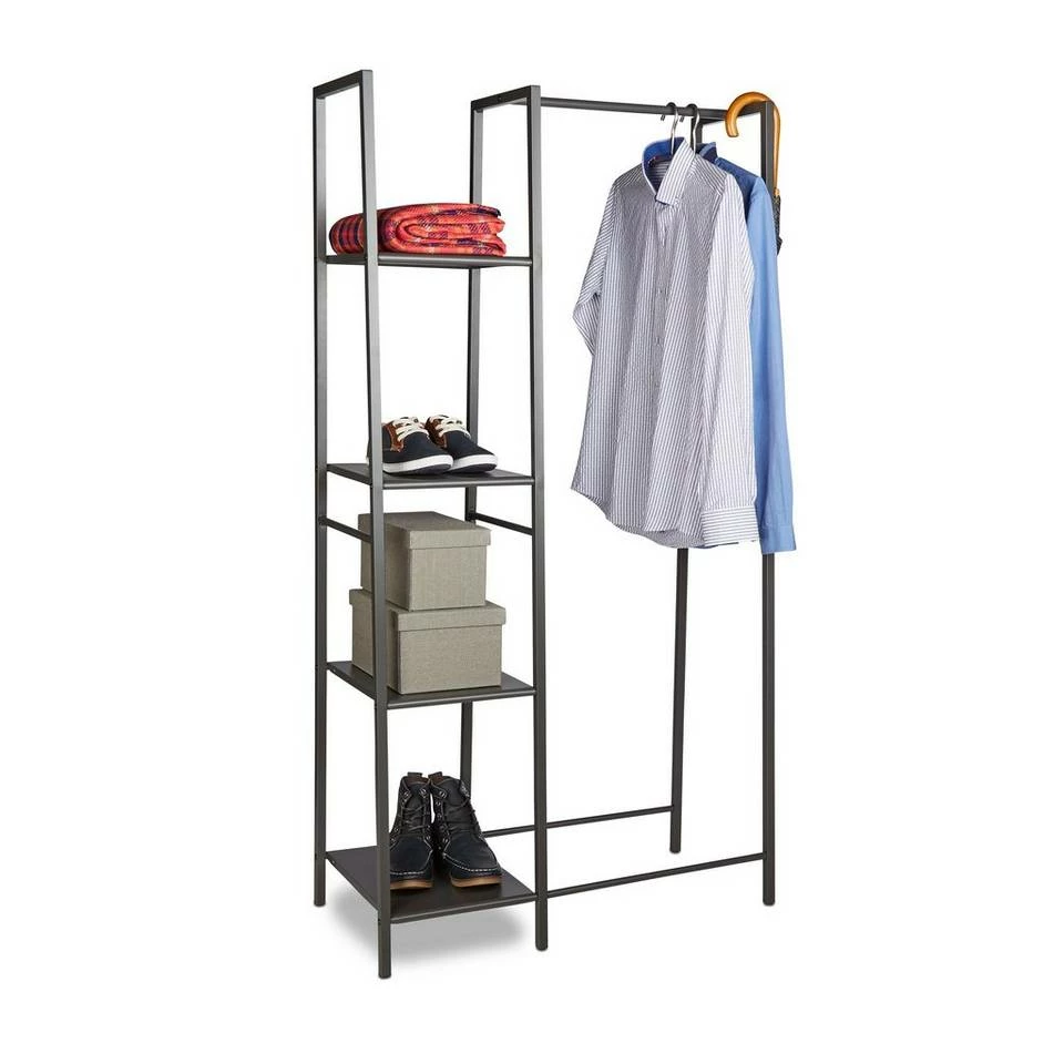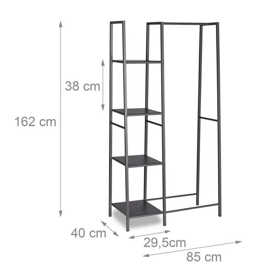 Kleiderständer Metall mit Regal Nutzen Sie den Kleiderständer als Garderobe im Flur oder offenen Kleiderschrank im Schlafzimmer. Auf der Kleiderstange ist Platz für Jacken, Kleider, Mäntel und Hemden. In den 4 zusätzlichen Ablagen verstauen Sie gestapelte Sachen wie Shirts, Hosen und Pullover. Auch hohe Schuhe und Stiefel passen hier hinein. Der Kleiderständer ist komplett aus Metall gefertigt und sehr stabil. Sein dunkles Anthrazit fügt sich elegant und stilvoll in jede Einrichtung. Auch am Arbeitsplatz oder im Büro schafft der Garderobenständer Platz und Ordnung.