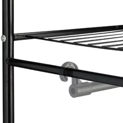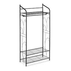 Offener Kleiderschrank im Vintage Stil Der Garderobenständer wird nicht nur zum neuen Blickfang in Ihrem Flur oder Schlafzimmer, dank vieler Ablagemöglichkeiten sorgt er gleichzeitig für Ordnung. Nutzen Sie die unteren Fächer bspw. als kleines Schuhregal oder zur Aufbewahrung von Ordnungsboxen. Die obere Ebene eignet sich vor allem als Hutablage oder für Mützen und Schals. An der Kleiderstange finden zusätzlich Hemden, Blusen oder Jacken ihren Platz. Mit dem schlichten Vintage Design fügt sich die Standgarderobe in jede Einrichtung.